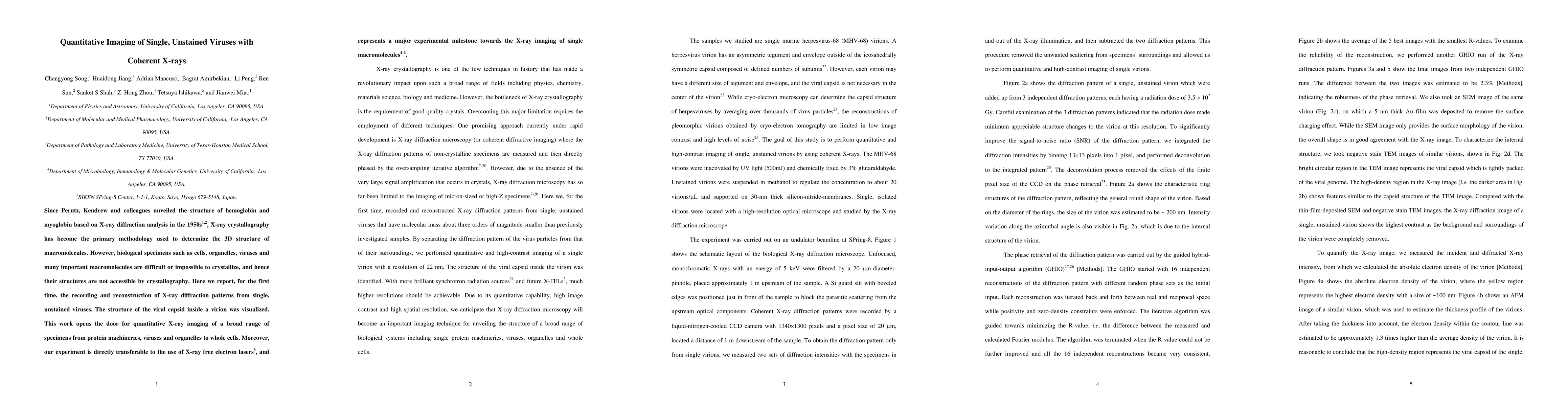 This paper presents the first successful X-ray diffraction imaging of single, unstained viruses, enabling visualization of their internal structure without staining. This breakthrough paves the way for quantitative imaging of a wide range of biological specimens using X-rays, including whole cells.