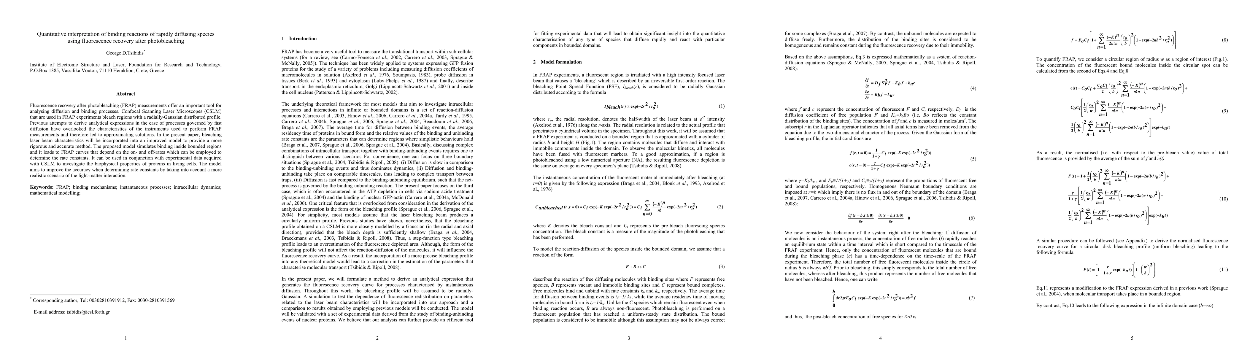 This paper proposes an improved quantitative model for analyzing fluorescence recovery after photobleaching (FRAP) measurements, incorporating the Gaussian profile of the bleaching laser beam to enhance accuracy. The model can determine binding and diffusion rate constants more precisely by simulating binding within bounded regions.