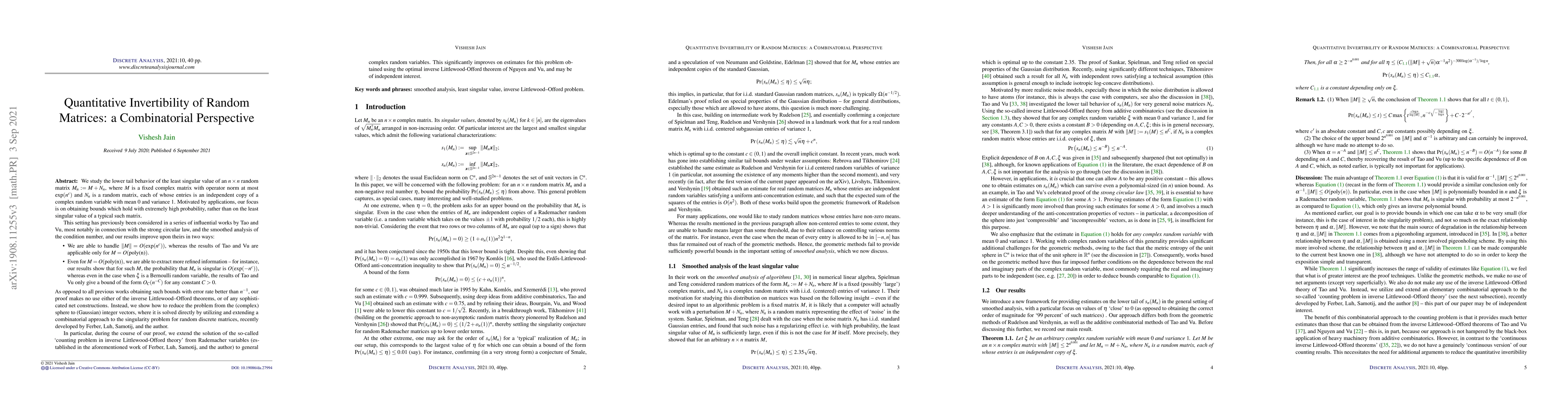 We study the lower tail behavior of the least singular value of an $n\times n$ random matrix $M_n := M+N_n$, where $M$ is a fixed complex matrix with operator norm at most $\exp(n^{c})$ and $N_n$ is a random matrix, each of whose entries is an independent copy of a complex random variable with mean $0$ and variance $1$. Motivated by applications, our focus is on obtaining bounds which hold with extremely high probability, rather than on the least singular value of a typical such matrix. This setting has previously been considered in a series of influential works by Tao and Vu, most notably in connection with the strong circular law, and the smoothed analysis of the condition number, and our results improve upon theirs in two ways: (i) We are able to handle $\|M\| = O(\exp(n^{c}))$, whereas the results of Tao and Vu are applicable only for $M = O(\text{poly(n)})$. (ii) Even for $M = O(\text{poly(n)})$, we are able to extract more refined information -- for instance, our results show that for such $M$, the probability that $M_n$ is singular is $O(\exp(-n^{c}))$, whereas even in the case when $\xi$ is a Bernoulli random variable, the results of Tao and Vu only give a bound of the form $O_{C}(n^{-C})$ for any constant $C>0$. As opposed to all previous works obtaining such bounds with error rate better than $n^{-1}$, our proof makes no use either of the inverse Littlewood--Offord theorems, or of any sophisticated net constructions. Instead, we show how to reduce the problem from the (complex) sphere to (Gaussian) integer vectors, where it is solved directly by utilizing and extending a combinatorial approach to the singularity problem for random discrete matrices, recently developed by Ferber, Luh, Samotij, and the author.