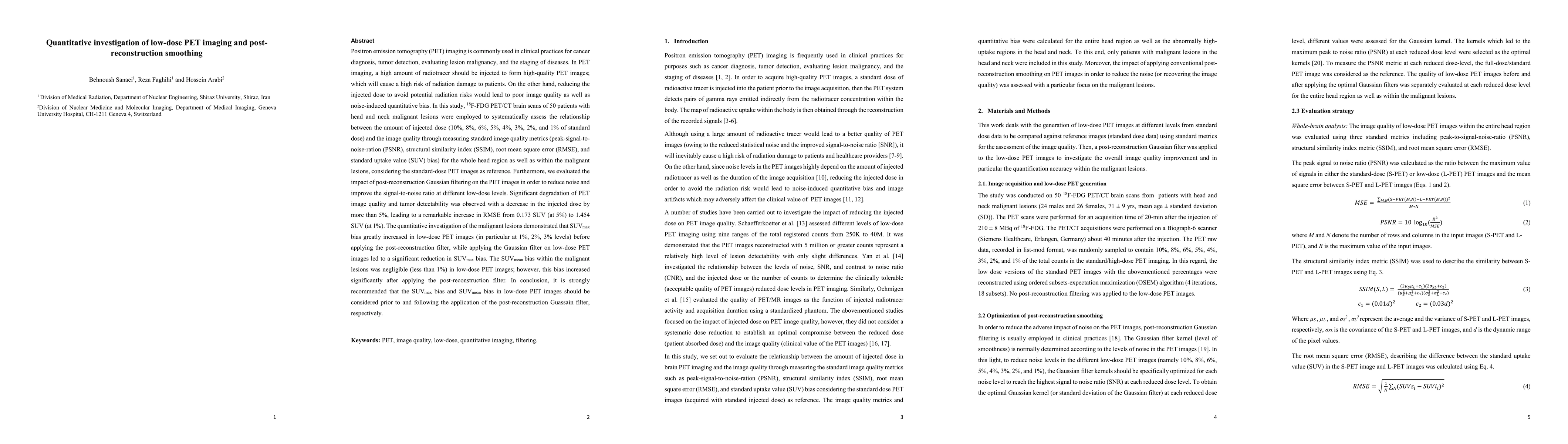 This study investigates the effects of varying low-dose levels on 18F-FDG PET/CT image quality and tumor detectability, finding significant degradation below 5% of standard dose. Post-reconstruction Gaussian filtering improved signal-to-noise ratio, notably reducing SUVmax bias but increasing SUVmean bias in low-dose PET images.