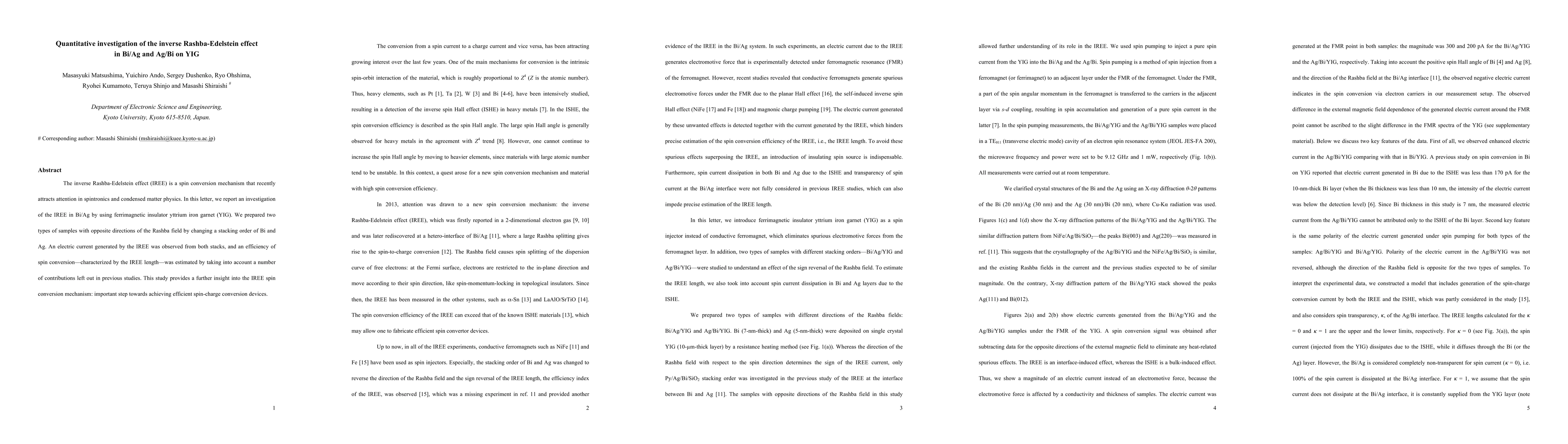 The inverse Rashba-Edelstein effect (IREE) is a spin conversion mechanism that recently attracts attention in spintronics and condensed matter physics. In this letter, we report an investigation of the IREE in Bi/Ag by using ferrimagnetic insulator yttrium iron garnet (YIG). We prepared two types of samples with opposite directions of the Rashba field by changing a stacking order of Bi and Ag. An electric current generated by the IREE was observed from both stacks, and an efficiency of spin conversion -characterized by the IREE length- was estimated by taking into account a number of contributions left out in previous studies. This study provides a further insight into the IREE spin conversion mechanism: important step towards achieving efficient spin-charge conversion devices.