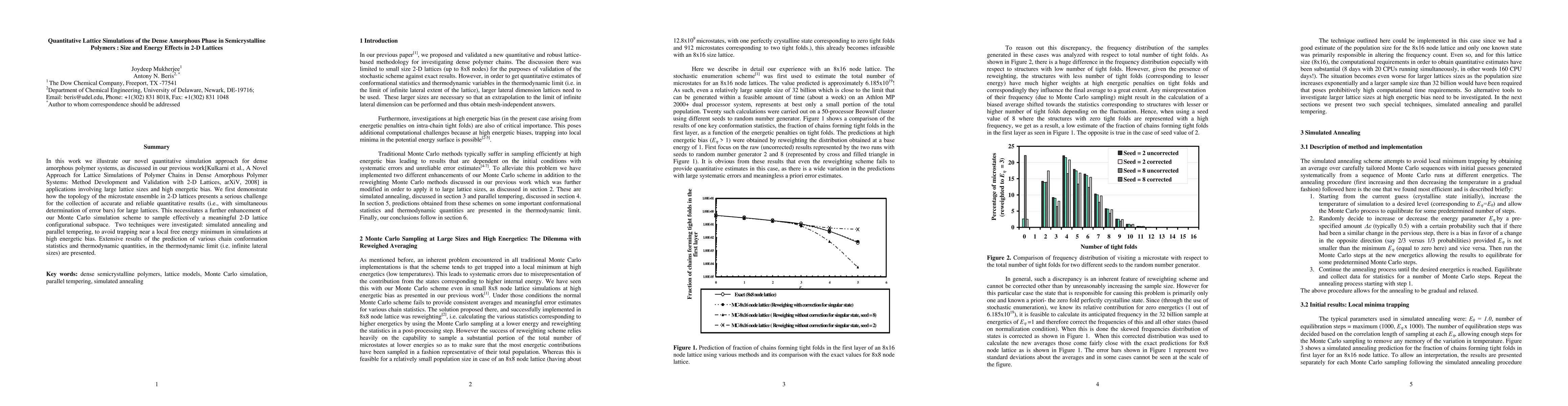 In this work we illustrate our novel quantitative simulation approach for dense amorphous polymer systems, as discussed in our previous work[Kulkarni et al., A Novel Approach for Lattice Simulations of Polymer Chains in Dense Amorphous Polymer Systems: Method Development and Validation with 2-D Lattices, arXiV, 2008] in applications involving large lattice sizes and high energetic bias. We first demonstrate how the topology of the microstate ensemble in 2-D lattices presents a serious challenge for the collection of accurate and reliable quantitative results (i.e., with simultaneous determination of error bars) for large lattices. This necessitates a further enhancement of our Monte Carlo simulation scheme to sample effectively a meaningful 2-D lattice configurational subspace. Two techniques were investigated: simulated annealing and parallel tempering, to avoid trapping near a local free energy minimum in simulations at high energetic bias. Extensive results of the prediction of various chain conformation statistics and thermodynamic quantities, in the thermodynamic limit (i.e. infinite lateral sizes) are presented.