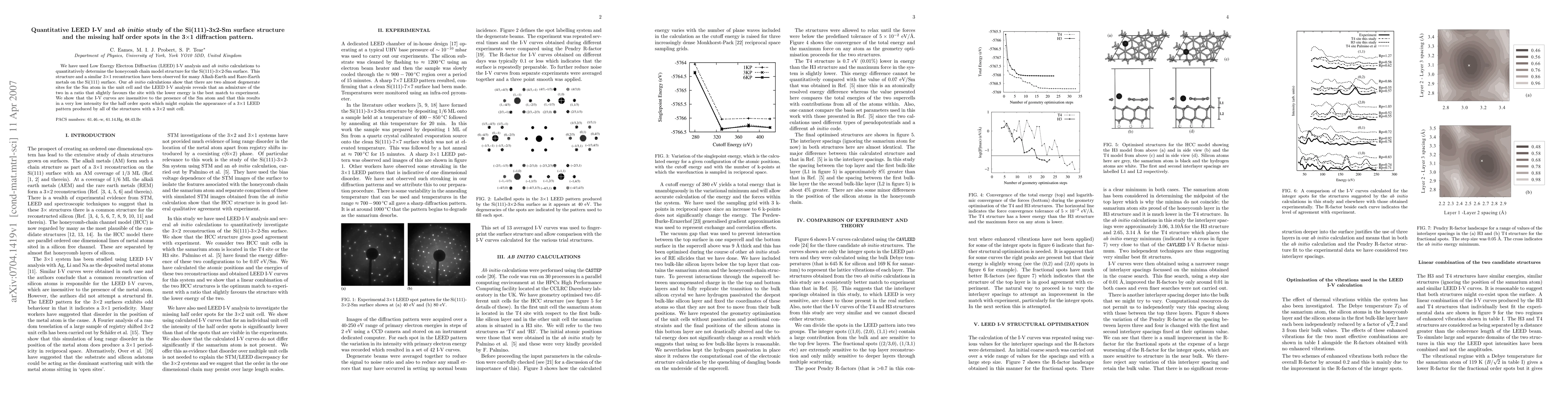 The research uses LEED I-V analysis and ab initio calculations to confirm the honeycomb chain model of the Si(111)-3x2-Sm surface structure. It reveals two nearly equivalent Sm atom sites, with a slight preference for the lower energy one, explaining the low intensity of half order spots and the observed 3x1 LEED pattern in various metal-on-Si(111) systems.