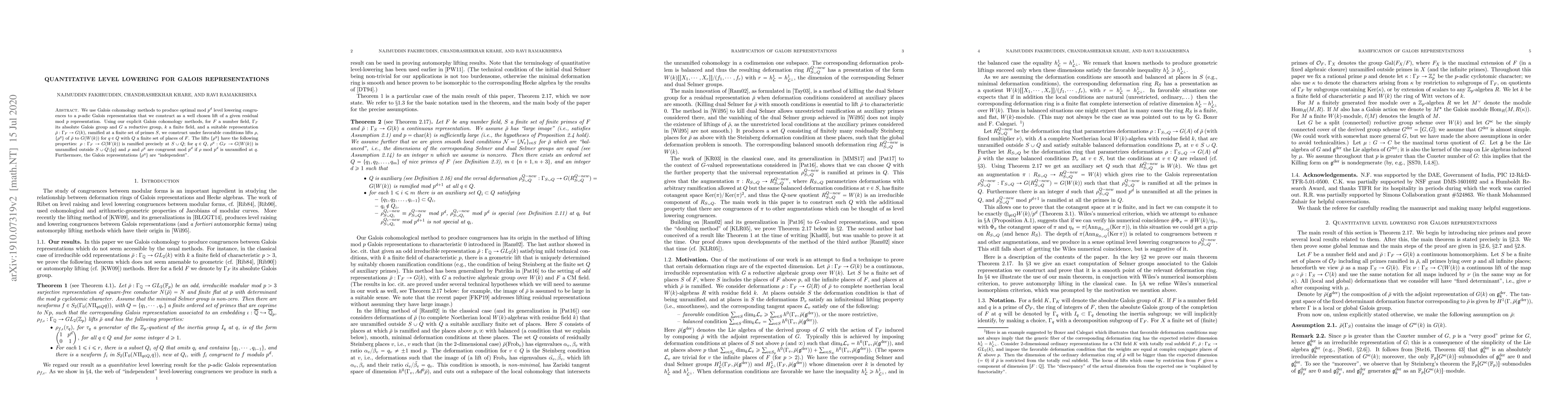 We use Galois cohomology methods to produce optimal mod $p^d$ level lowering congruences to a $p$-adic Galois representation that we construct as a well chosen lift of a given residual mod $p$ representation. Using our explicit Galois cohomology methods, we construct for a reductive group $G$ and a given residual representation $\bar{\rho}: \Gamma_F \to G(k)$, ramified at a finite set of primes $S$, in favorable conditions that we identify, a finite set of lifts $\rho$, $\{\rho^q\}$ of $\bar{\rho}$ to $G(W(k))$ with the following properties: $\rho: \Gamma_F \to G(W(k))$ is ramified precisely at $S \cup Q$, with $Q$ a finite set of primes disjoint from $S$. For $q \in Q$, $\rho^q:G_F \to G(W(k))$ is unramified outside $S \cup Q \backslash \{q\}$ and $\rho$ and $\rho^q$ are congruent mod $p^d$ if $\rho$ mod $p^d$ is unramified at $q$. Furthermore, the Galois representations $\{\rho^q\}$ are "independent".