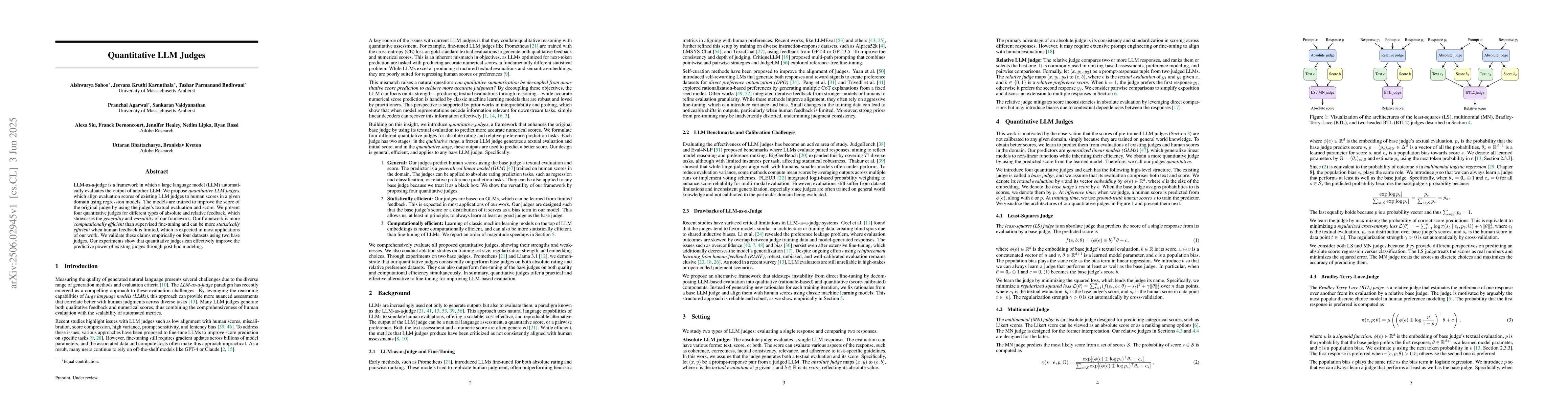 The research proposes quantitative LLM judges, which align evaluation scores of existing LLM judges to human scores in a given domain using regression models. These models are trained to enhance the original judge's score with the judge's textual evaluation and assigned score.
