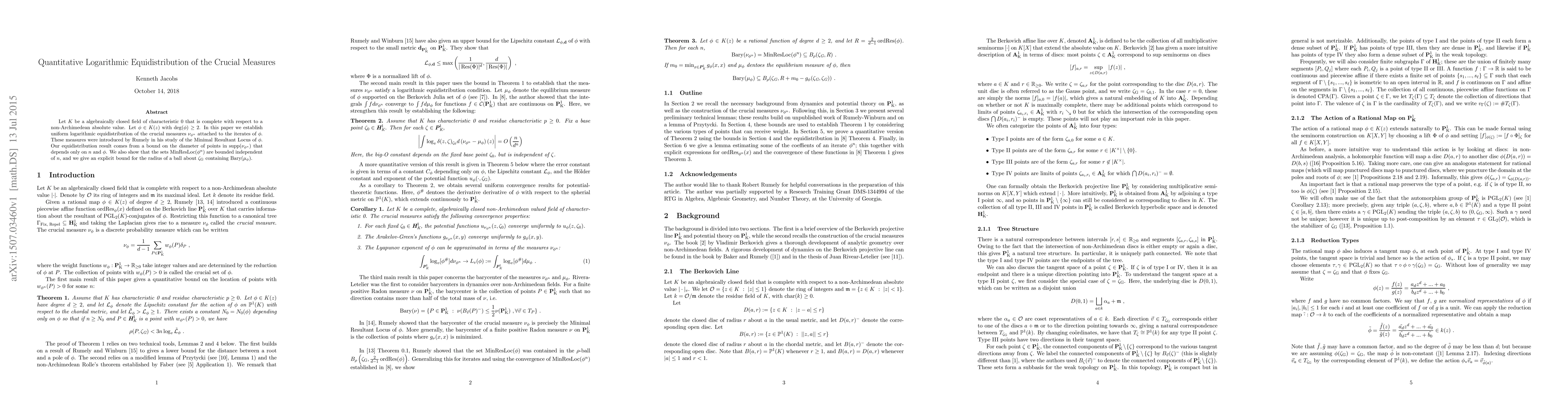 This paper establishes uniform logarithmic equidistribution of crucial measures attached to iterates of a polynomial $ ho$ over an algebraically closed field, with bounds on diameter and minimal resultant locus sets.