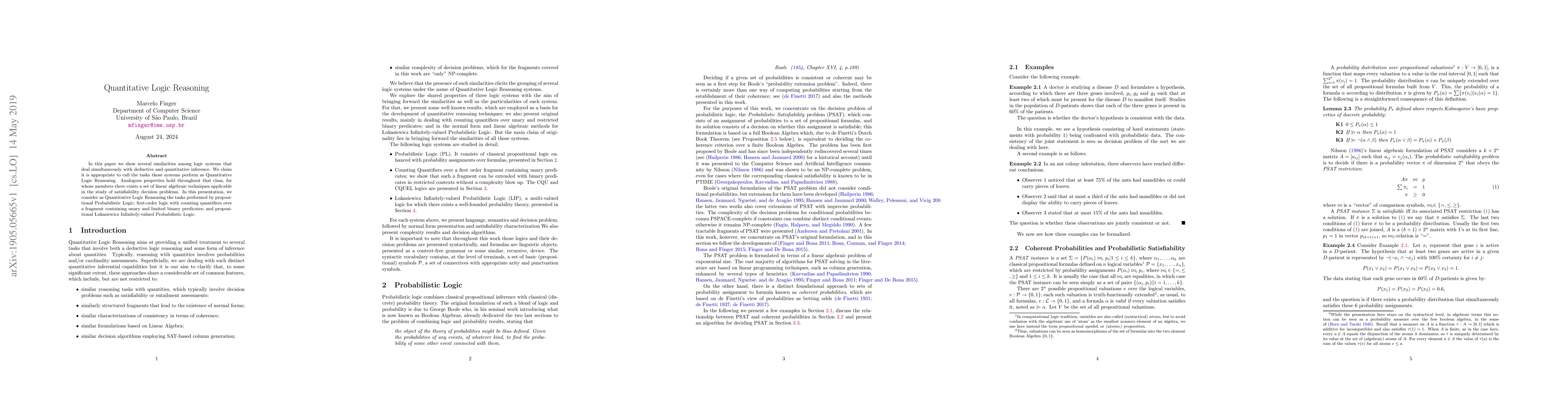 In this paper we show several similarities among logic systems that deal simultaneously with deductive and quantitative inference. We claim it is appropriate to call the tasks those systems perform as Quantitative Logic Reasoning. Analogous properties hold throughout that class, for whose members there exists a set of linear algebraic techniques applicable in the study of satisfiability decision problems. In this presentation, we consider as Quantitative Logic Reasoning the tasks performed by propositional Probabilistic Logic; first-order logic with counting quantifiers over a fragment containing unary and limited binary predicates; and propositional Lukasiewicz Infinitely-valued Probabilistic Logic