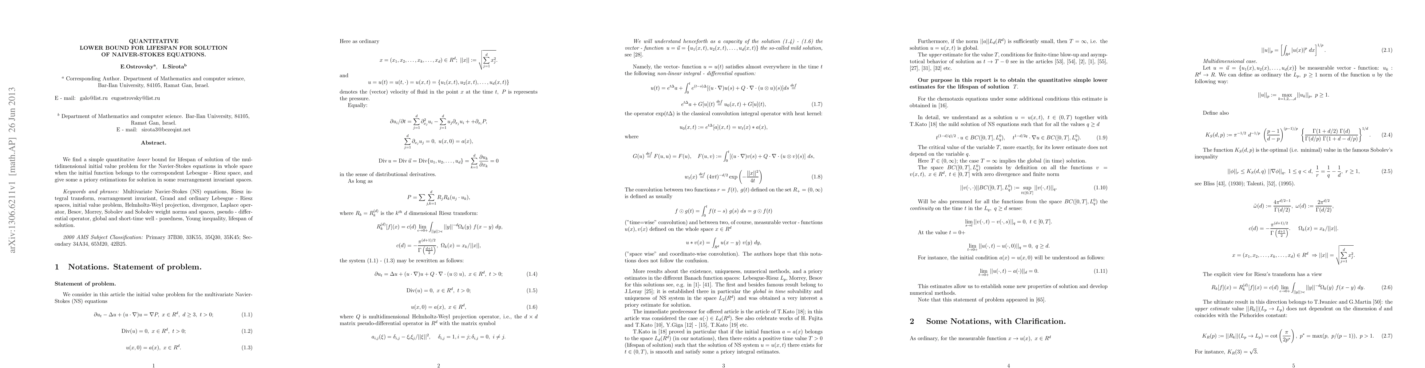 This paper establishes a quantitative lower bound for the lifespan of solutions to the multidimensional Navier-Stokes equations in whole space, provided the initial function is in a specified Lebesgue-Riesz space, and provides a priori estimates for solutions in rearrangement invariant spaces.