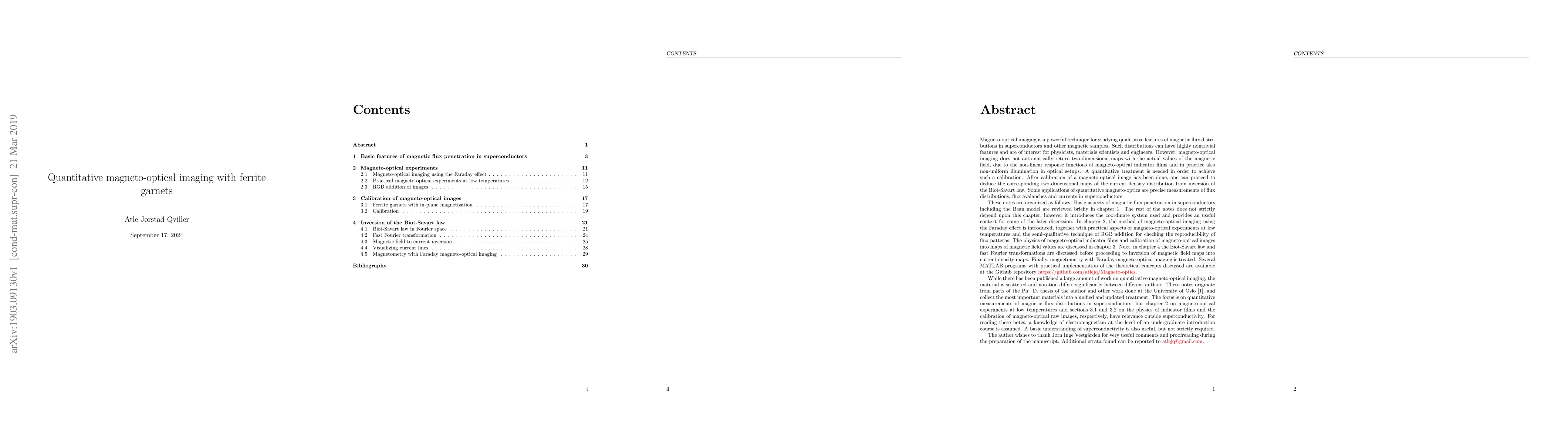Magneto-optical imaging is a powerful technique for studying qualitative features of magnetic flux distributions in superconductors and other magnetic samples. However, magneto-optical imaging does not automatically return two-dimensional maps with the actual values of the magnetic field, due to the non-linear response functions of magneto-optical indicator films and in practice also non-uniform illumination. A quantitative treatment is needed in order to achieve such a calibration. After calibration, one can proceed to deduce the corresponding two-dimensional maps of the current density distribution from inversion of the Biot-Savart law. While there has been published a large amount of work on quantitative magneto-optical imaging, the material is scattered and notation differs significantly between different authors. These notes originate from parts of the Ph. D. thesis of the author and collect the most important materials into a unified and updated treatment. Basic aspects of magnetic flux penetration in superconductors including the Bean model are reviewed briefly in chapter 1. In chapter 2, the method of magneto-optical imaging using the Faraday effect is introduced, together with practical aspects of magneto-optical experiments at low temperatures and the semi-qualitative technique of RGB addition for checking the reproducibility of flux patterns. The physics of magneto-optical indicator films and calibration of magneto-optical images into maps of magnetic field values are discussed in chapter 3. Next, in chapter 4 the Biot-Savart law and fast Fourier transformations are discussed before proceeding to inversion of magnetic field maps into current density maps. Finally, magnetometry with Faraday magneto-optical imaging is treated. MATLAB codes for several of the discussed concepts can be found at https://github.com/atlejq/Magneto-optics