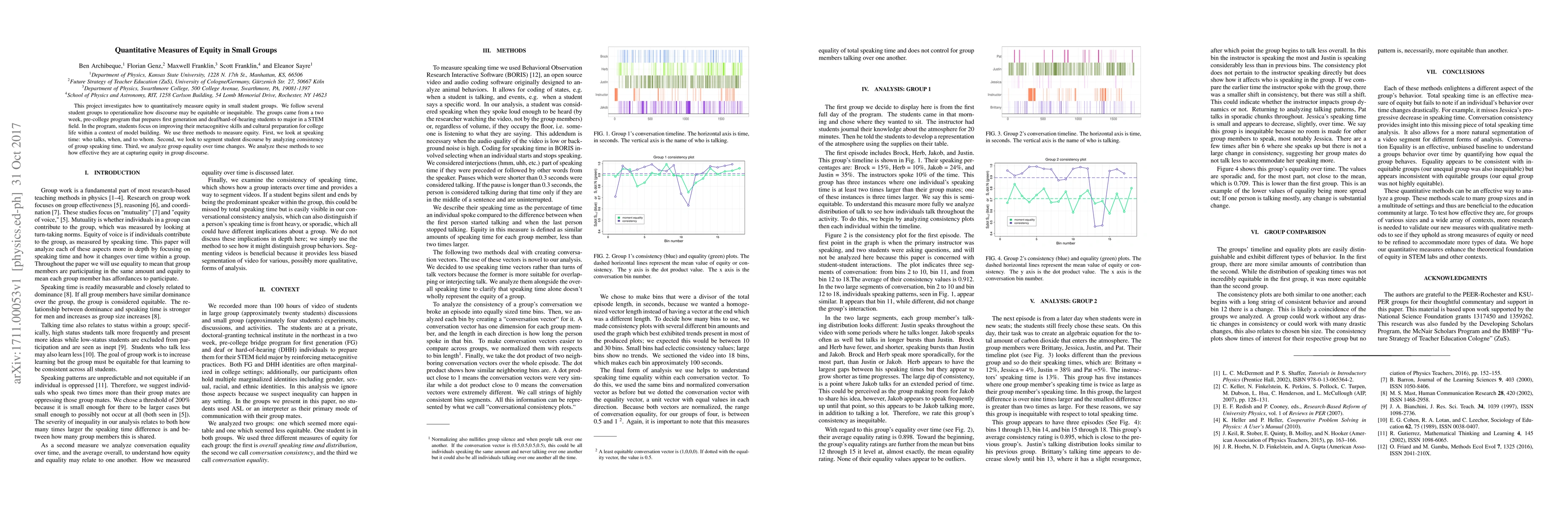 This study quantitatively measures equity in small student groups through speaking time analysis, consistency of group speaking time, and equality over time changes. The research focuses on first-generation and deaf/hard-of-hearing students in a pre-college STEM program, aiming to capture how well these methods reflect equitable discourse.