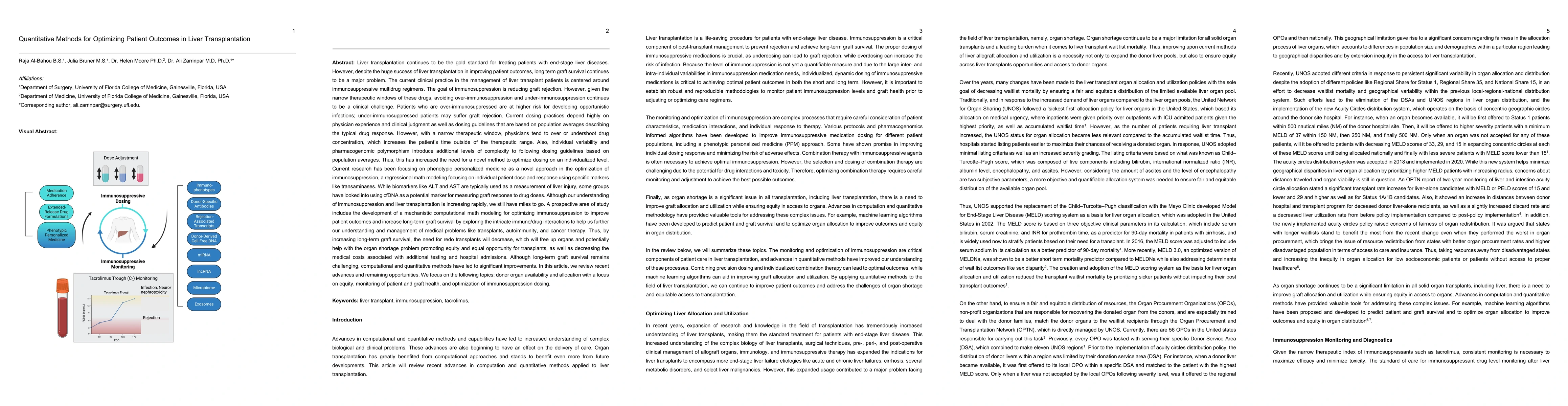 This paper reviews quantitative methods for optimizing patient outcomes in liver transplantation, focusing on improving long-term graft survival through personalized immunosuppression and computational modeling. It highlights the potential to reduce the need for redo transplants, address organ shortage, and lower medical costs by enhancing donor organ allocation, patient health monitoring, and immunosuppression optimization.