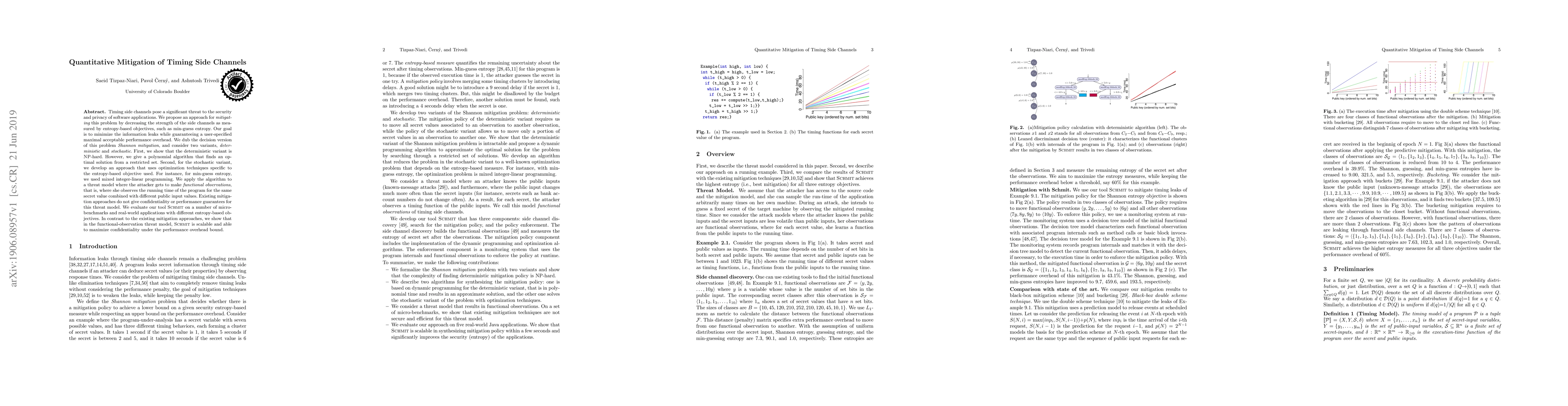This paper proposes a quantitative approach to mitigate timing side channels by minimizing information leaks using entropy-based metrics, while ensuring a specified performance overhead. The authors develop algorithms for both deterministic and stochastic variants, demonstrating scalability and confidentiality maximization under performance constraints in a functional-observation threat model.