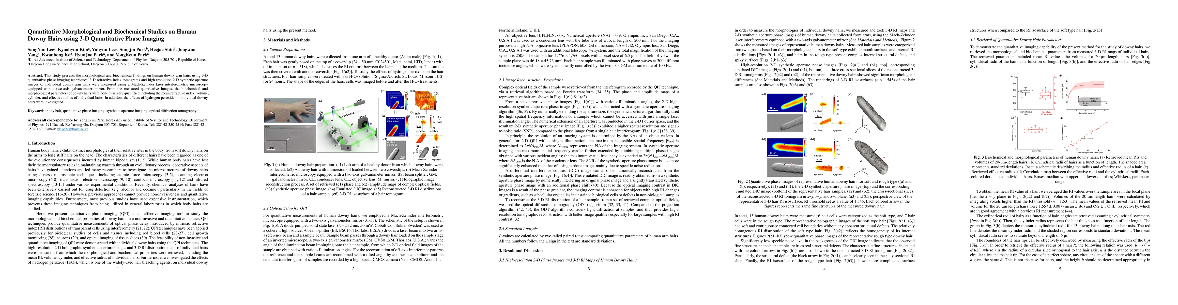 This study presents the morphological and biochemical findings on human downy arm hairs using 3-D quantitative phase imaging techniques. 3-D refractive index tomograms and high-resolution 2-D synthetic aperture images of individual downy arm hairs were measured using a Mach-Zehnder laser interferometric microscopy equipped with a two-axis galvanometer mirror. From the measured quantitative images, the biochemical and morphological parameters of downy hairs were non-invasively quantified including the mean refractive index, volume, cylinder, and effective radius of individual hairs. In addition, the effects of hydrogen peroxide on individual downy hairs were investigated.