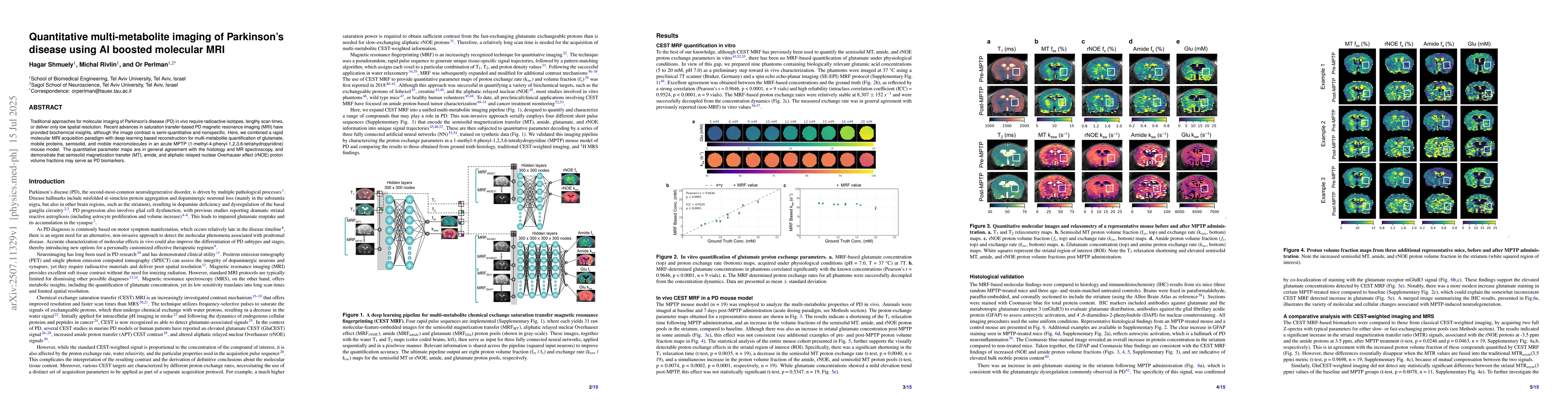 Traditional approaches for molecular imaging of Parkinson's disease (PD) in vivo require radioactive isotopes, lengthy scan times, or deliver only low spatial resolution. Recent advances in saturation transfer-based PD magnetic resonance imaging (MRI) have provided biochemical insights, although the image contrast is semi-quantitative and nonspecific. Here, we combined a rapid molecular MRI acquisition paradigm with deep learning based reconstruction for multi-metabolite quantification of glutamate, mobile proteins, semisolid, and mobile macromolecules in an acute MPTP (1-methyl-4-phenyl-1,2,3,6-tetrahydropyridine) mouse model. The quantitative parameter maps are in general agreement with the histology and MR spectroscopy, and demonstrate that semisolid magnetization transfer (MT), amide, and aliphatic relayed nuclear Overhauser effect (rNOE) proton volume fractions may serve as PD biomarkers.