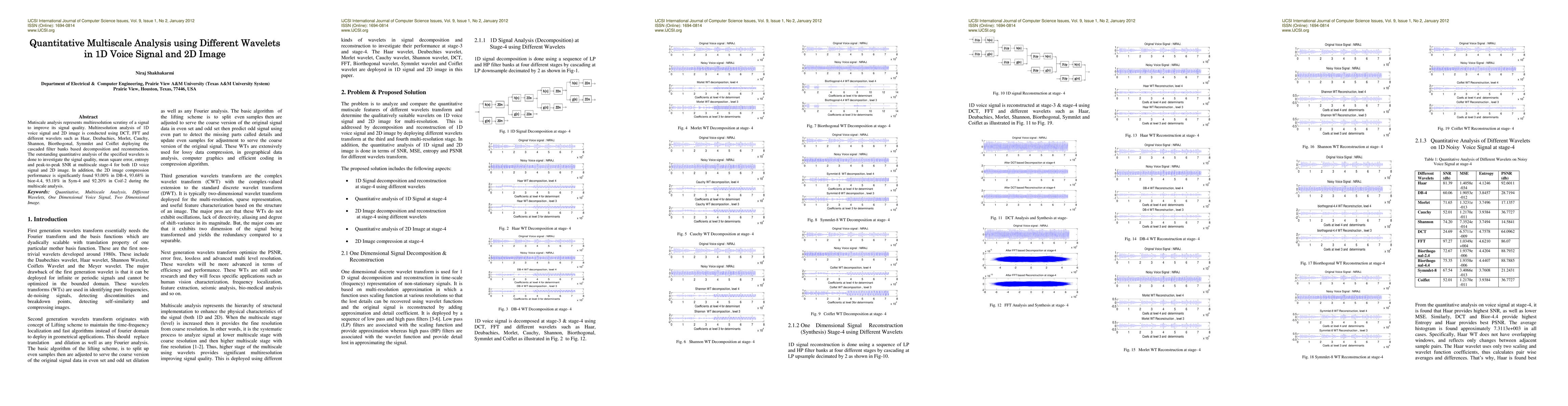 This paper conducts a quantitative multiscale analysis of 1D voice signals and 2D images using various wavelets and transforms, comparing their performance based on signal quality, mean square error, entropy, and peak-to-peak SNR. The study finds significant compression performance for 2D images, particularly with wavelets like DB-4 and bior-4.4.