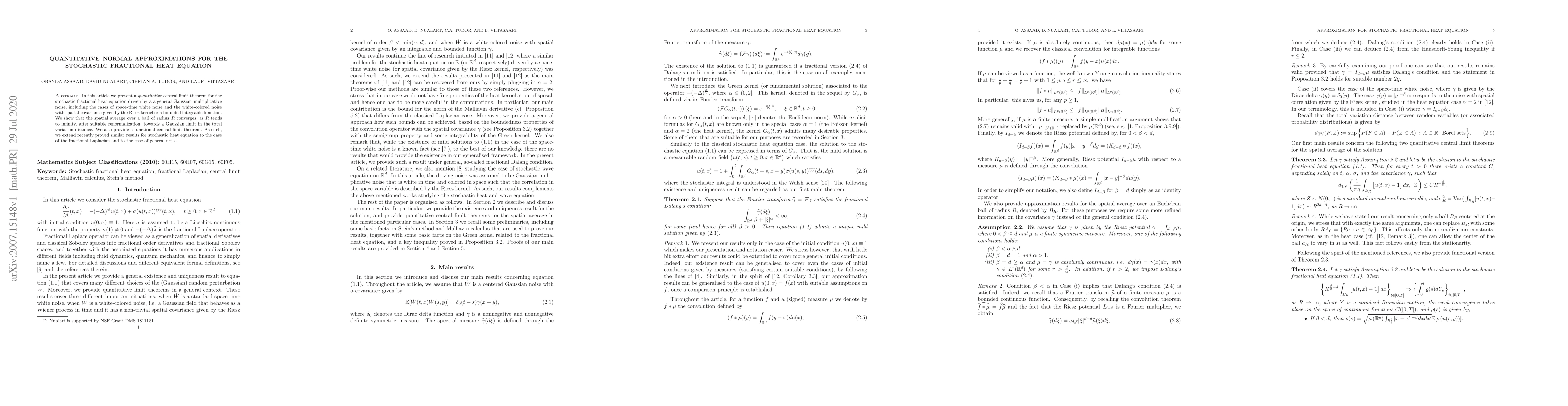 This paper presents a quantitative central limit theorem for the stochastic fractional heat equation, showing that the spatial average converges to a Gaussian limit after renormalization. It extends similar results for the stochastic heat equation to the fractional Laplacian and general noise scenarios.