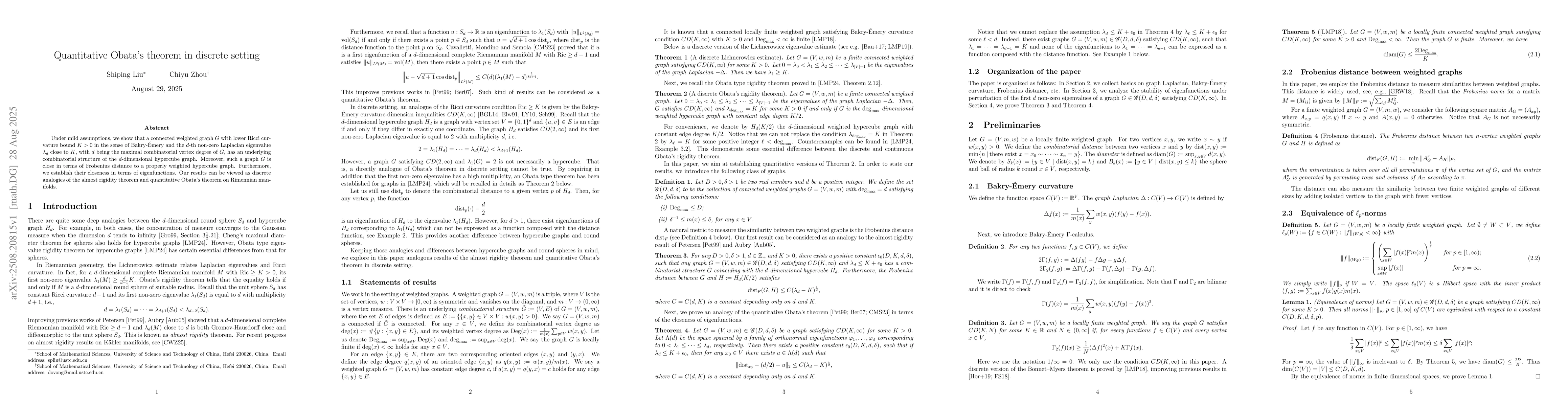 Under mild assumptions, we show that a connected weighted graph $G$ with lower Ricci curvature bound $K>0$ in the sense of Bakry-\'Emery and the $d$-th non-zero Laplacian eigenvalue $\lambda_d$ close to $K$, with $d$ being the maximal combinatorial vertex degree of $G$, has an underlying combinatorial structure of the $d$-dimensional hypercube graph. Moreover, such a graph $G$ is close in terms of Frobenius distance to a properly weighted hypercube graph. Furthermore, we establish their closeness in terms of eigenfunctions. Our results can be viewed as discrete analogies of the almost rigidity theorem and quantitative Obata's theorem on Rimennian manifolds.