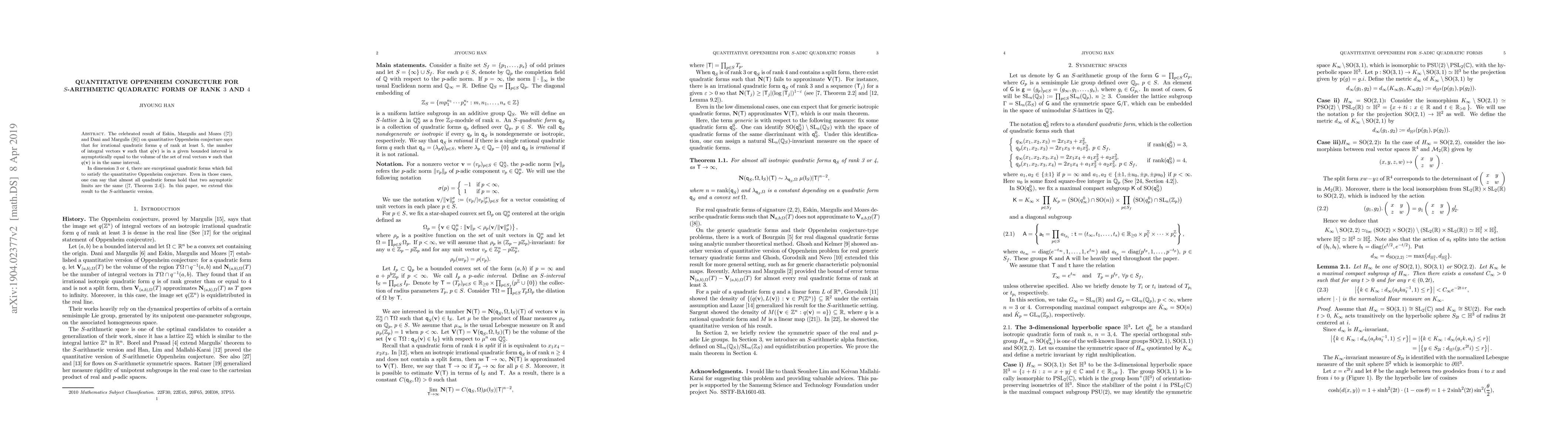 This paper extends the quantitative Oppenheim conjecture to $S$-arithmetic quadratic forms of rank $3$ and $4$, showing that almost all such forms satisfy the conjecture, even when they are exceptional. The result builds on previous work by Eskin, Margulis, Mozes, Dani, and Margulis for higher ranks.