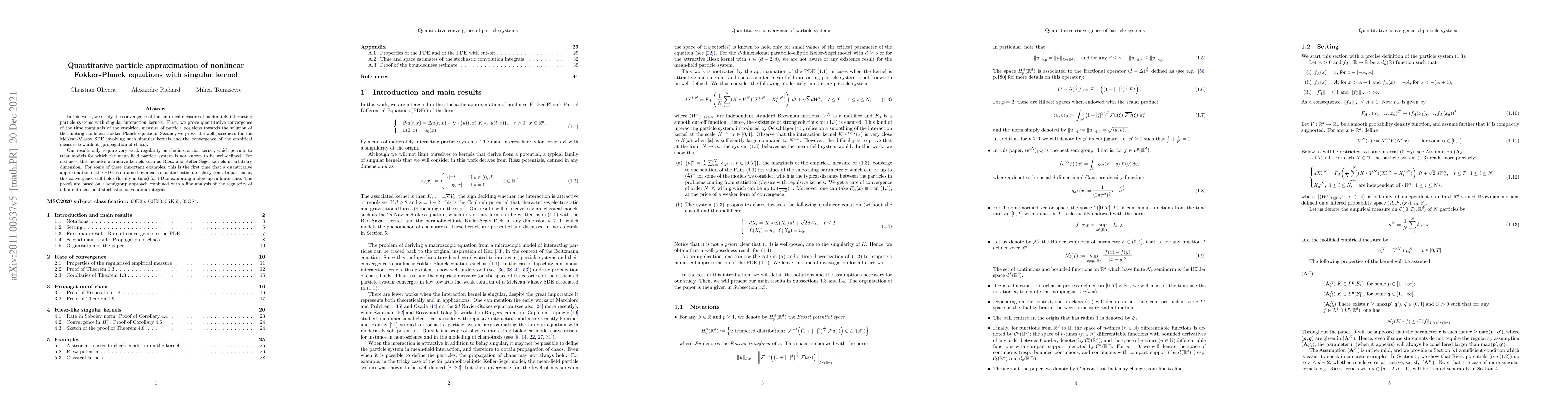 In this work, we study the convergence of the empirical measure of moderately interacting particle systems with singular interaction kernels. First, we prove quantitative convergence of the time marginals of the empirical measure of particle positions towards the solution of the limiting nonlinear Fokker-Planck equation. Second, we prove the well-posedness for the McKean-Vlasov SDE involving such singular kernels and the convergence of the empirical measure towards it (propagation of chaos). Our results only require very weak regularity on the interaction kernel, including the Biot-Savart kernel, and attractive kernels such as Riesz and Keller-Segel kernels in arbitrary dimension. For some of these important examples, this is the first time that a quantitative approximation of the PDE is obtained by means of a stochastic particle system. In particular, this convergence still holds (locally in time) for PDEs exhibiting a blow-up in finite time. The proofs are based on a semigroup approach combined with a fine analysis of the regularity of infinite-dimensional stochastic convolution integrals.