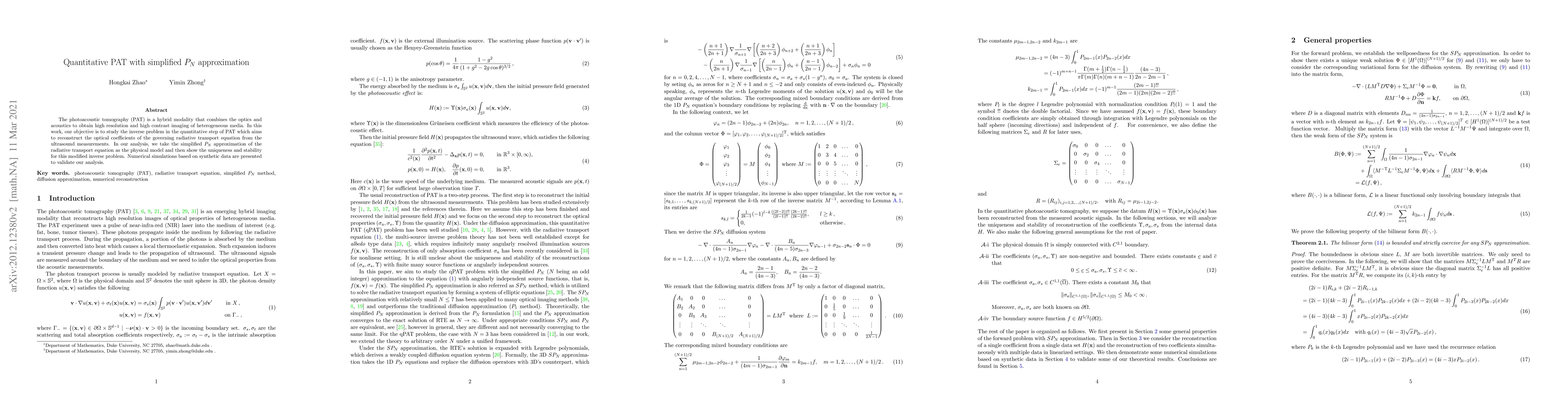 The photoacoustic tomography (PAT) is a hybrid modality that combines the optics and acoustics to obtain high resolution and high contrast imaging of heterogeneous media. In this work, our objective is to study the inverse problem in the quantitative step of PAT which aims to reconstruct the optical coefficients of the governing radiative transport equation from the ultrasound measurements. In our analysis, we take the simplified $P_N$ approximation of the radiative transport equation as the physical model and then show the uniqueness and stability for this modified inverse problem. Numerical simulations based on synthetic data are presented to validate our analysis.