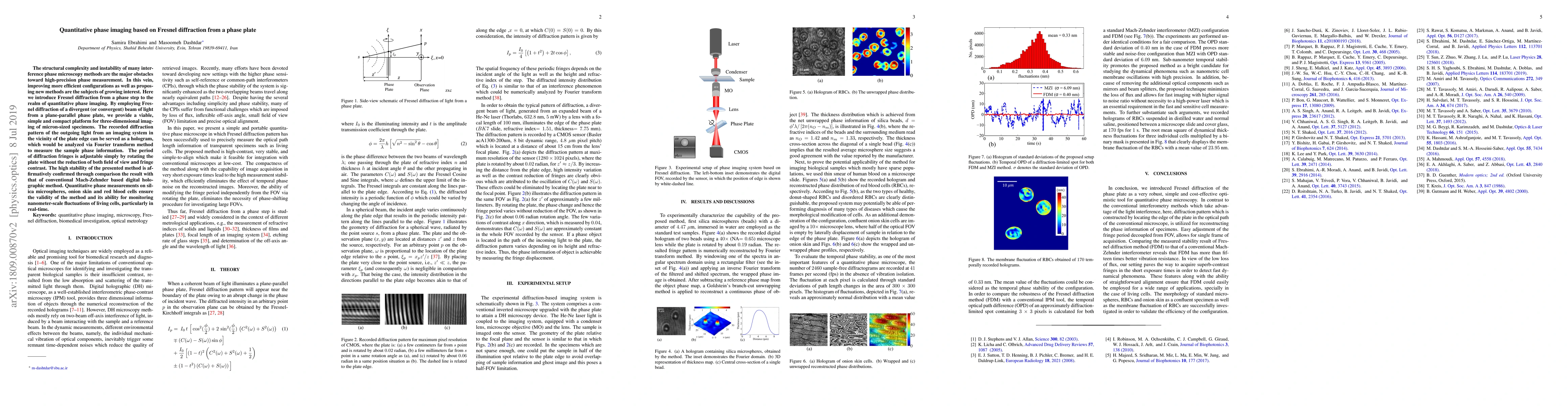 This paper proposes a novel quantitative phase imaging method based on Fresnel diffraction from a phase plate, offering a simple and stable platform for three-dimensional imaging of micron-sized specimens. The method's validity is demonstrated through high-precision phase measurements on various samples, including silica microspheres, onion skin, and red blood cells.