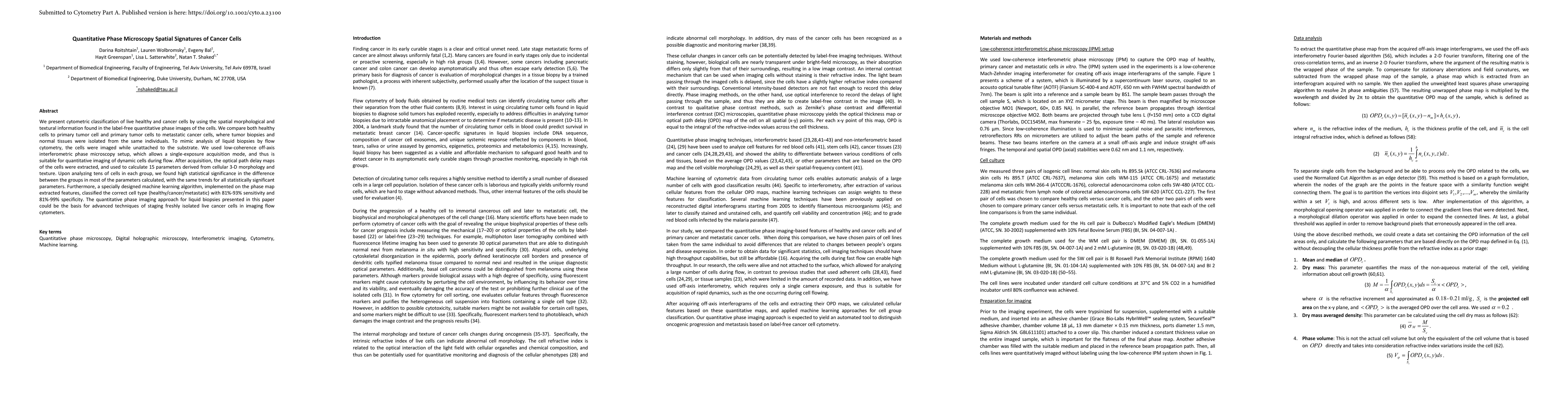 This paper presents a quantitative phase microscopy method for classifying live healthy and cancer cells using spatial morphological and textural information from label-free images. A machine learning algorithm based on extracted features from optical path delay maps achieved high sensitivity and specificity in distinguishing between healthy, primary tumor, and metastatic cancer cells.