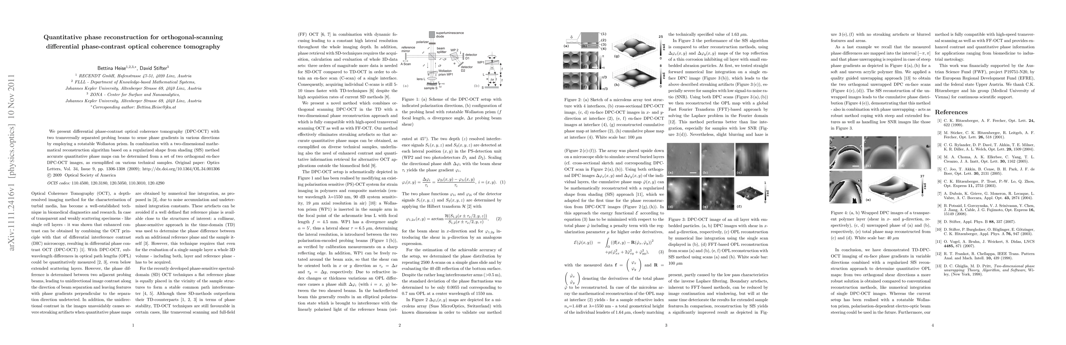 We present differential phase-contrast optical coherence tomography (DPC-OCT) with two transversally separated probing beams to sense phase gradients in various directions by employing a rotatable Wollaston prism. In combination with a two-dimensional mathe- matical reconstruction algorithm based on a regularized shape from shading (SfS) method accurate quantitative phase maps can be determined from a set of two orthogonal en-face DPC-OCT images, as exemplified on various technical samples.