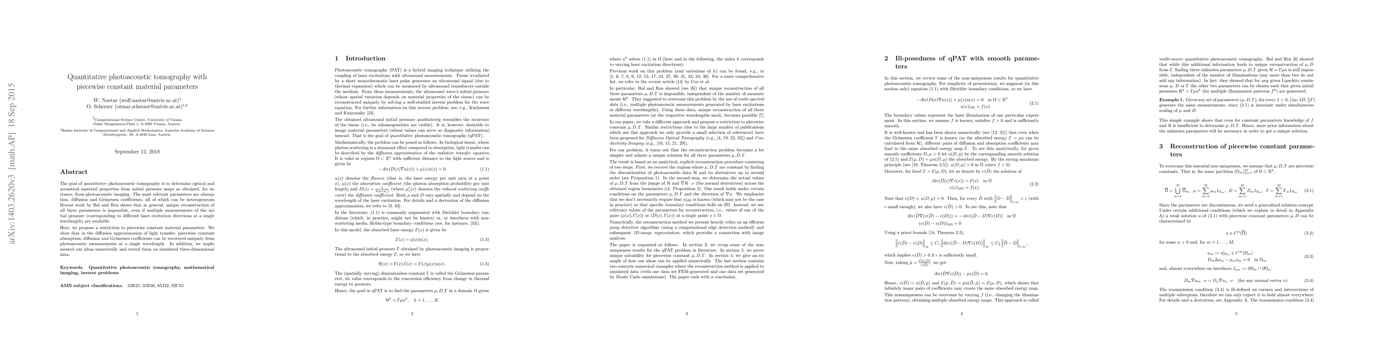The goal of quantitative photoacoustic tomography is to determine optical and acoustical material properties from initial pressure maps as obtained, for instance, from photoacoustic imaging. The most relevant parameters are absorption, diffusion and Grueneisen coefficients, all of which can be heterogeneous. Recent work by Bal and Ren shows that in general, unique reconstruction of all three parameters is impossible, even if multiple measurements of the initial pressure (corresponding to different laser excitation directions at a single wavelength) are available. Here, we propose a restriction to piecewise constant material parameters. We show that in the diffusion approximation of light transfer, piecewise constant absorption, diffusion and Gr\"uneisen coefficients can be recovered uniquely from photoacoustic measurements at a single wavelength. In addition, we implemented our ideas numerically and tested them on simulated three-dimensional data.