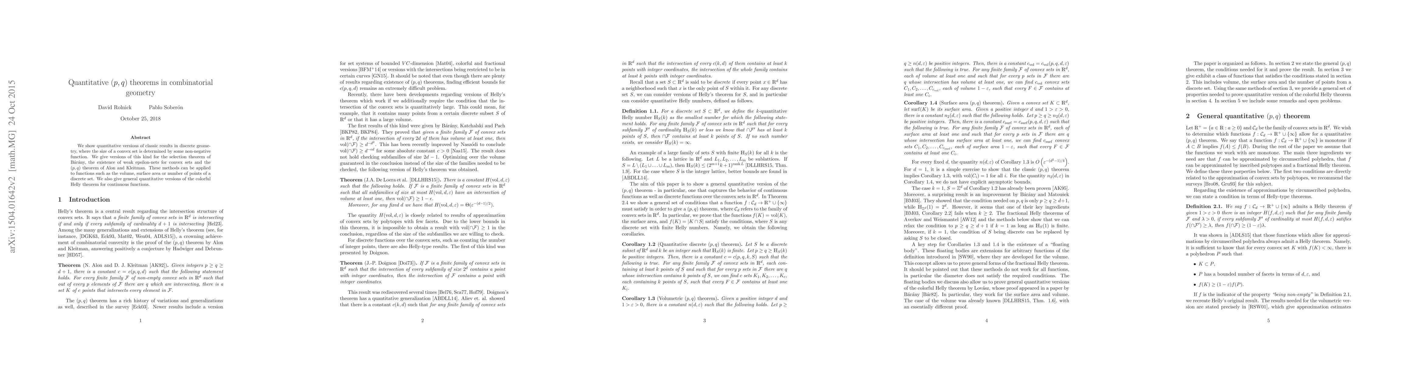 We show quantitative versions of classic results in discrete geometry, where the size of a convex set is determined by some non-negative function. We give versions of this kind for the selection theorem of B\'ar\'any, the existence of weak epsilon-nets for convex sets and the $(p,q)$ theorem of Alon and Kleitman. These methods can be applied to functions such as the volume, surface area or number of points of a discrete set. We also give general quantitative versions of the colorful Helly theorem for continuous functions.