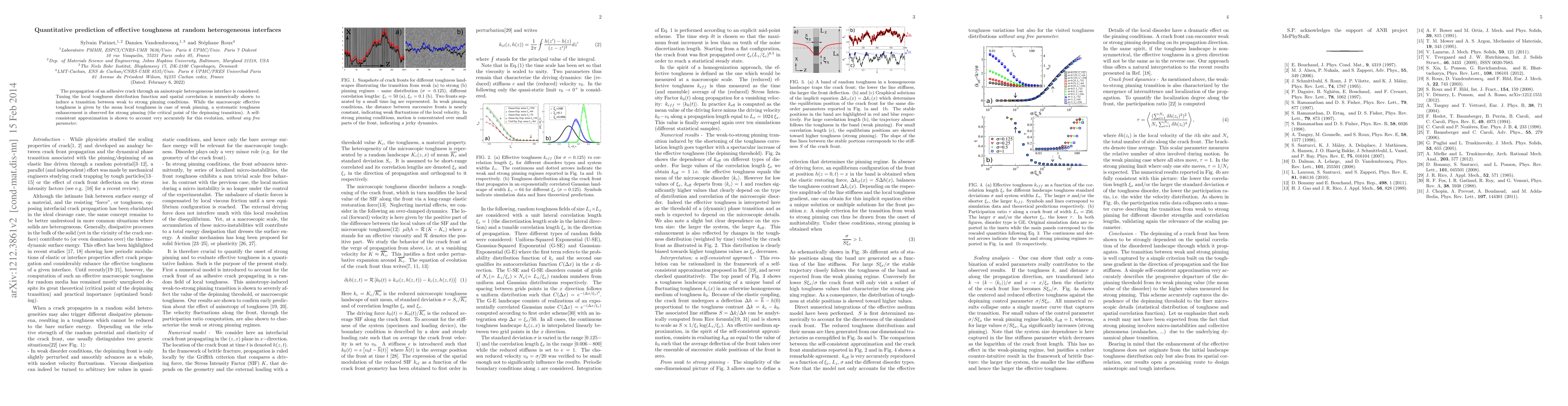 Researchers found that a transition occurs in how an adhesive crack propagates through a heterogeneous interface, leading to either weak or strong pinning conditions. Effective toughness can be predicted using a self-consistent approximation that accurately accounts for this transition without requiring any free parameters.