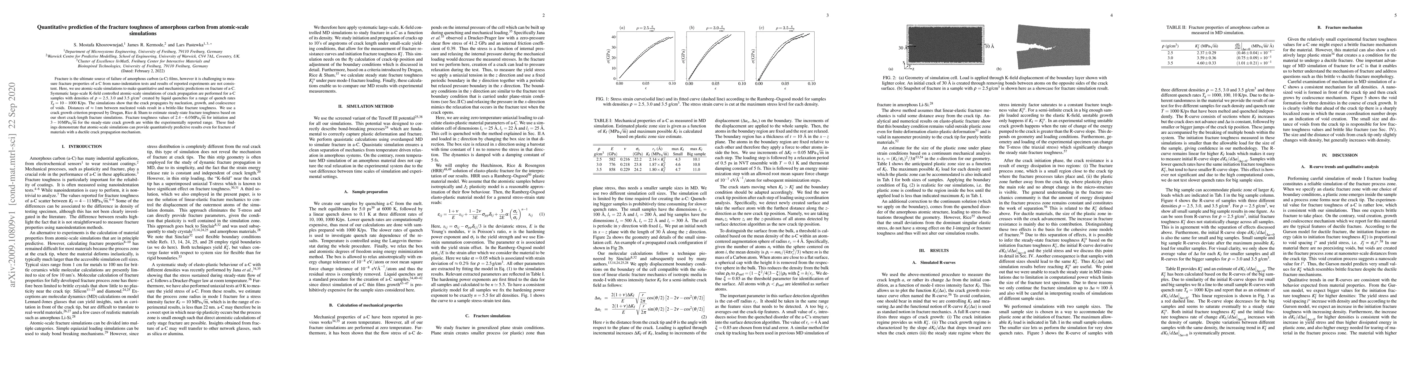 This paper uses atomic-scale simulations to quantitatively predict the fracture toughness of amorphous carbon (a-C) films, showing crack propagation occurs through nucleation, growth, and coalescence of voids. Estimated fracture toughness values match experimental ranges, indicating simulations provide reliable predictions for ductile materials.