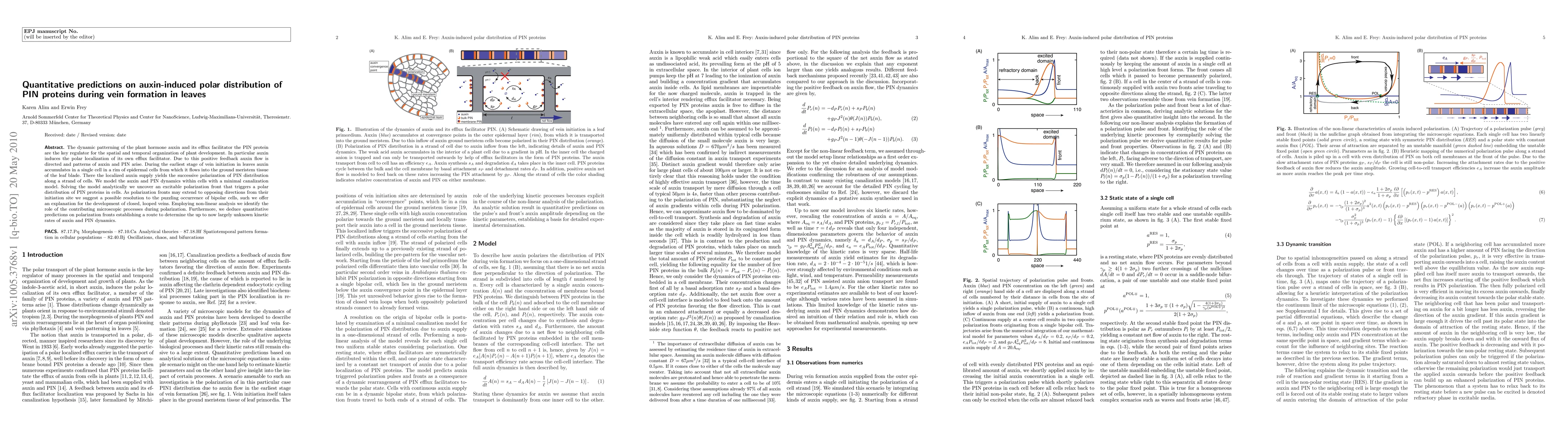 The dynamic patterning of the plant hormone auxin and its efflux facilitator the PIN protein are the key regulator for the spatial and temporal organization of plant development. In particular auxin induces the polar localization of its own efflux facilitator. Due to this positive feedback auxin flow is directed and patterns of auxin and PIN arise. During the earliest stage of vein initiation in leaves auxin accumulates in a single cell in a rim of epidermal cells from which it flows into the ground meristem tissue of the leaf blade. There the localized auxin supply yields the successive polarization of PIN distribution along a strand of cells. We model the auxin and PIN dynamics within cells with a minimal canalization model. Solving the model analytically we uncover an excitable polarization front that triggers a polar distribution of PIN proteins in cells. As polarization fronts may extend to opposing directions from their initiation site we suggest a possible resolution to the puzzling occurrence of bipolar cells, such we offer an explanation for the development of closed, looped veins. Employing non-linear analysis we identify the role of the contributing microscopic processes during polarization. Furthermore, we deduce quantitative predictions on polarization fronts establishing a route to determine the up to now largely unknown kinetic rates of auxin and PIN dynamics.