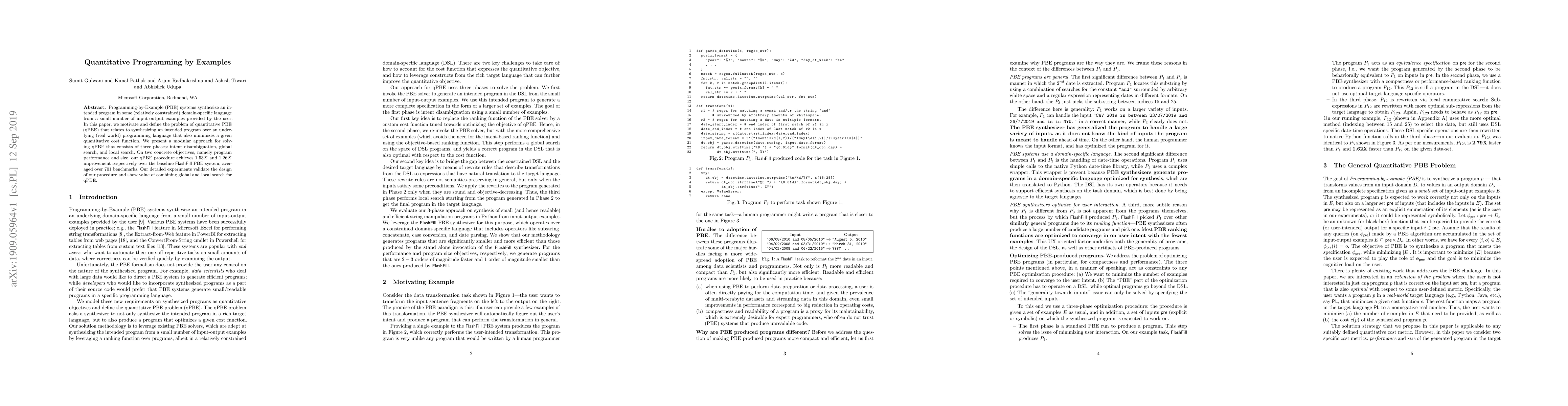 Programming-by-Example (PBE) systems synthesize an intended program in some (relatively constrained) domain-specific language from a small number of input-output examples provided by the user. In this paper, we motivate and define the problem of quantitative PBE (qPBE) that relates to synthesizing an intended program over an underlying (real world) programming language that also minimizes a given quantitative cost function. We present a modular approach for solving qPBE that consists of three phases: intent disambiguation, global search, and local search. On two concrete objectives, namely program performance and size, our qPBE procedure achieves $1.53 X$ and $1.26 X$ improvement respectively over the baseline FlashFill PBE system, averaged over $701$ benchmarks. Our detailed experiments validate the design of our procedure and show the value of combining global and local search for qPBE.