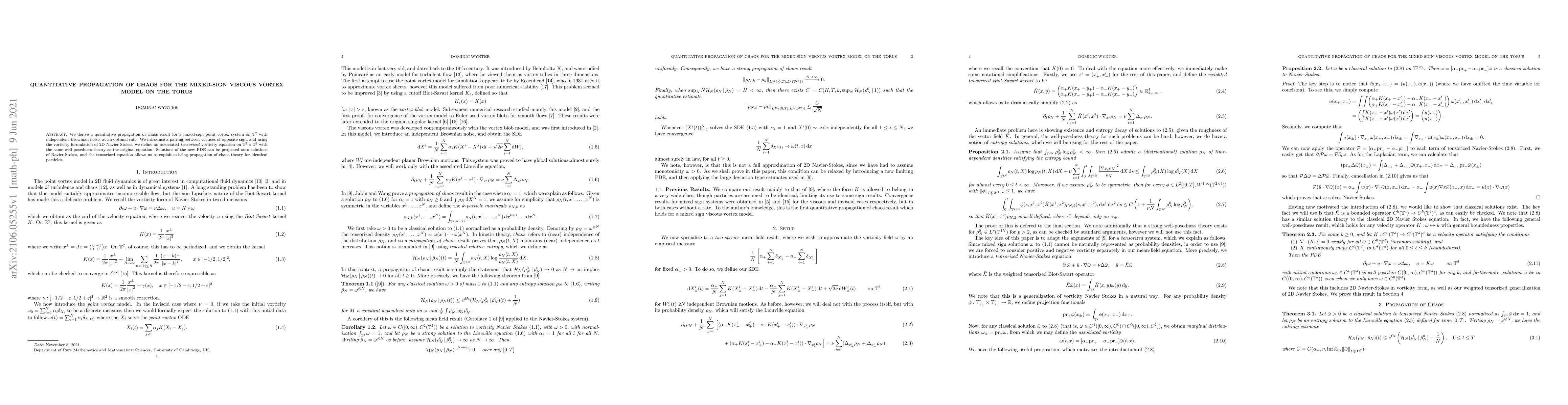 This paper presents a quantitative propagation of chaos result for a mixed-sign vortex system on the torus under Brownian noise, with optimal rate. The authors introduce a pairing method for vortices of opposite sign and define a tensorized vorticity equation to exploit existing chaos theory for identical particles.