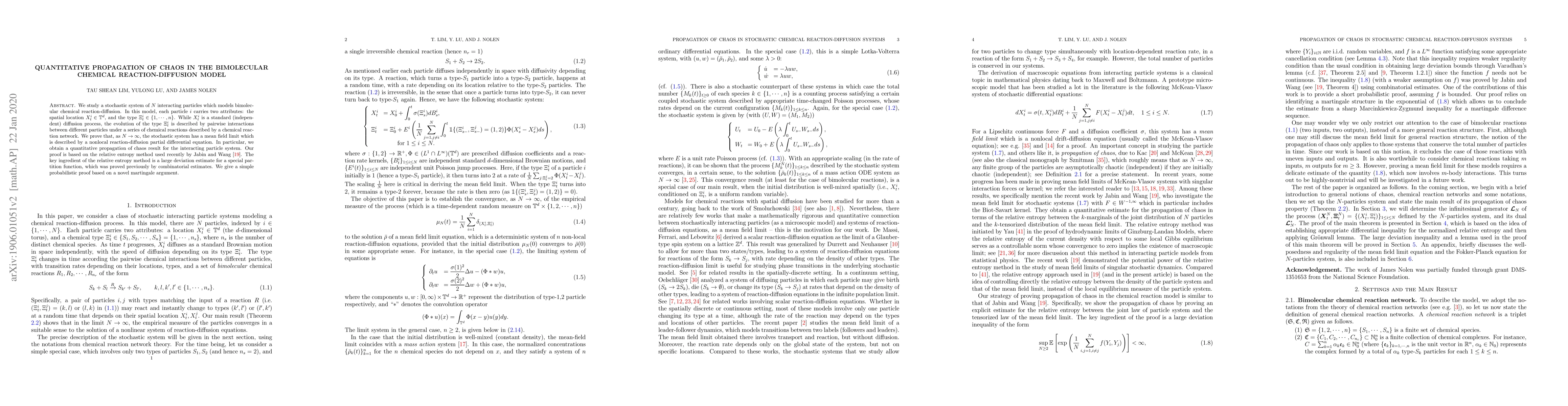 We study a stochastic system of $N$ interacting particles which models bimolecular chemical reaction-diffusion. In this model, each particle $i$ carries two attributes: the spatial location $X_t^i\in \mathbb{T}^d$, and the type $\Xi_t^i\in \{1,\cdots,n\}$. While $X_t^i$ is a standard (independent) diffusion process, the evolution of the type $\Xi_t^i$ is described by pairwise interactions between different particles under a series of chemical reactions described by a chemical reaction network. We prove that in the large particle limit the stochastic dynamics converges to a mean field limit which is described by a nonlocal reaction-diffusion partial differential equation. In particular, we obtain a quantitative propagation of chaos result for the interacting particle system. Our proof is based on the relative entropy method used recently by Jabin and Wang \cite{JW18}. The key ingredient of the relative entropy method is a large deviation estimate for a special partition function, which was proved previously by technical combinatorial estimates. We give a simple probabilistic proof based on a novel martingale argument.
