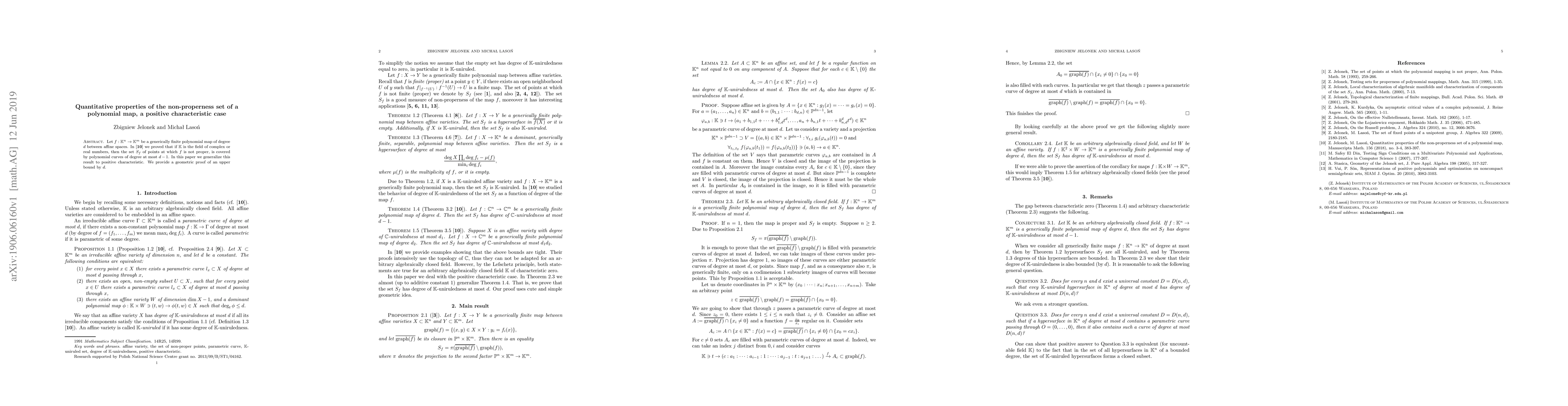 Let $f:\mathbb{K}^n\rightarrow\mathbb{K}^m$ be a generically finite polynomial map of degree $d$ between affine spaces. In arXiv:1411.5011 we proved that if $\mathbb{K}$ is the field of complex or real numbers, then the set $S_f$ of points at which $f$ is not proper, is covered by polynomial curves of degree at most $d-1$. In this paper we generalize this result to positive characteristic. We provide a geometric proof of an upper bound by $d$.