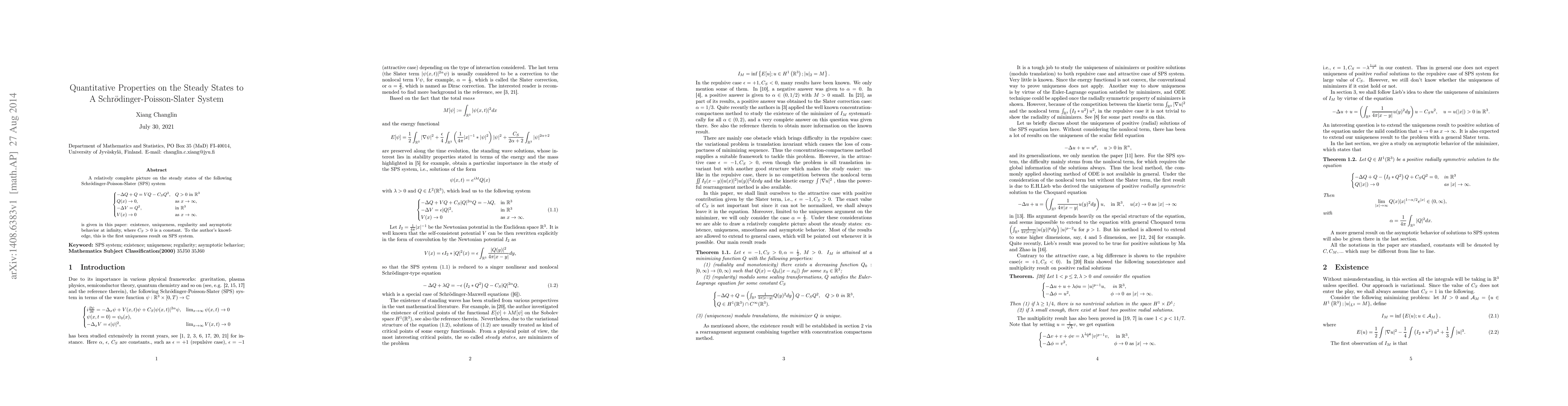 A relatively complete picture on the steady states of the following Schr$\ddot{o}$dinger-Poisson-Slater (SPS) system \[ \begin{cases} -\Delta Q+Q=VQ-C_{S}Q^{2}, & Q>0\text{ in }\mathbb{R}^{3}\\ Q(x)\to0, & \mbox{as }x\to\infty,\\ -\Delta V=Q^{2}, & \text{in }\mathbb{R}^{3}\\ V(x)\to0 & \mbox{as }x\to\infty. \end{cases} \] is given in this paper: existence, uniqueness, regularity and asymptotic behavior at infinity, where $C_{S}>0$ is a constant. To the author's knowledge, this is the first uniqueness result on SPS system.