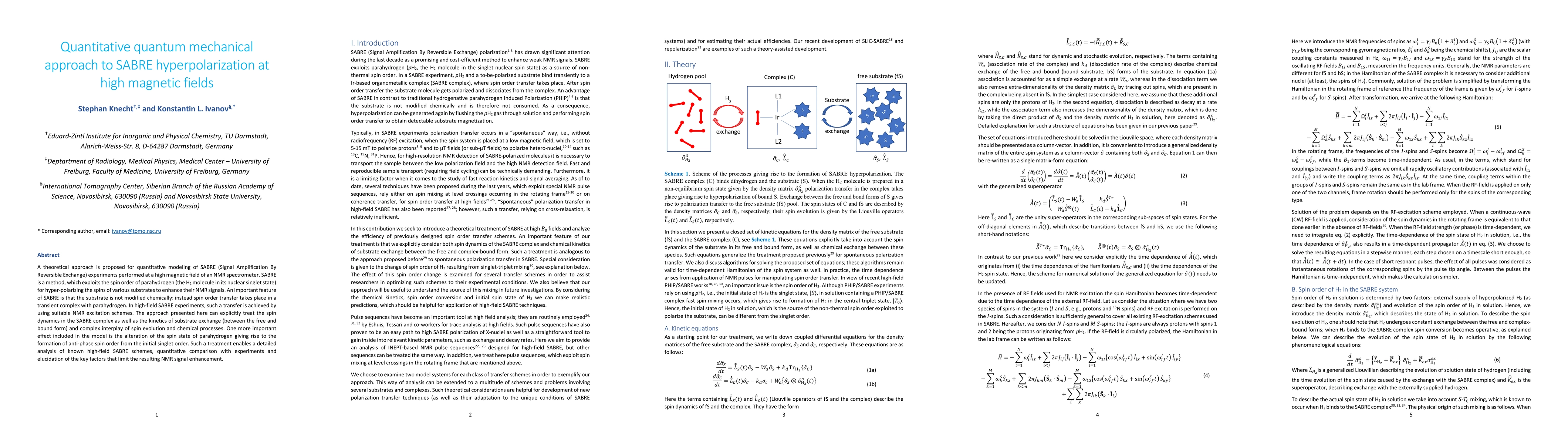 This paper proposes a quantitative quantum mechanical model for SABRE hyperpolarization experiments at high magnetic fields, focusing on the spin dynamics and kinetics of substrate exchange in the SABRE complex, and the transformation of parahydrogen's spin state to enhance NMR signal analysis. The model aids in understanding the factors limiting NMR signal enhancement in high-field SABRE schemes.