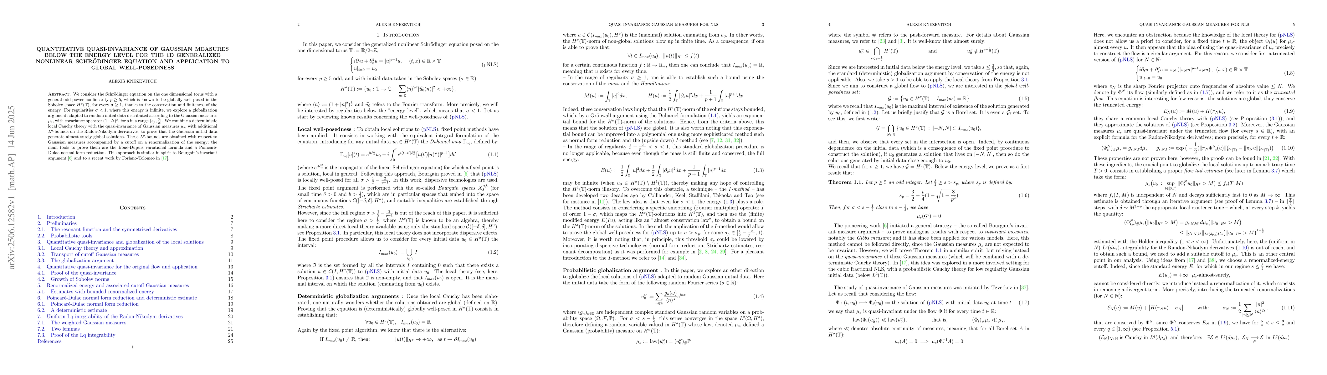 We consider the Schr\"odinger equation on the one dimensional torus with a general odd-power nonlinearity $p \geq 5$, which is known to be globally well-posed in the Sobolev space $H^\sigma(\mathbb{T})$, for every $\sigma \geq 1$, thanks to the conservation and finiteness of the energy. For regularities $\sigma < 1$, where this energy is infinite, we explore a globalization argument adapted to random initial data distributed according to the Gaussian measures $\mu_s$, with covariance operator $(1-\Delta)^s$, for $s$ in a range $(s_p,\frac{3}{2}]$. We combine a deterministic local Cauchy theory with the quasi-invariance of Gaussian measures $\mu_s$, with additional $L^q$-bounds on the Radon-Nikodym derivatives, to prove that the Gaussian initial data generate almost surely global solutions. These $L^q$-bounds are obtained with respect to Gaussian measures accompanied by a cutoff on a renormalization of the energy; the main tools to prove them are the Bou\'e-Dupuis variational formula and a Poincar\'e-Dulac normal form reduction. This approach is similar in spirit to Bourgain's invariant argument and to a recent work by Forlano-Tolomeo.