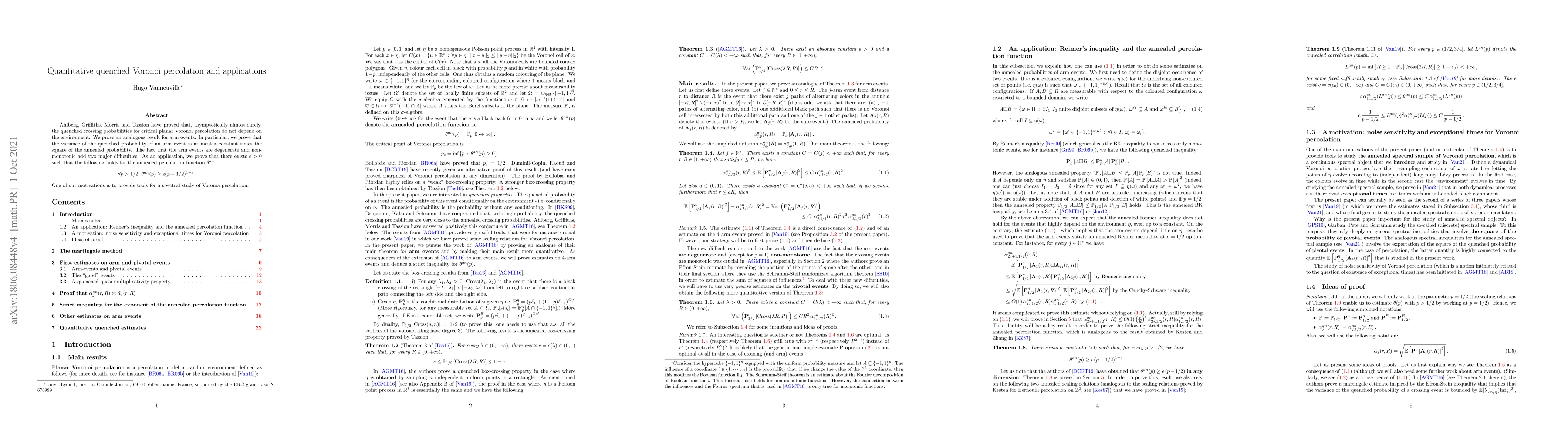The paper introduces novel techniques for analyzing quenched percolation in Voronoi tessellations, specifically proving a quenched version of the scaling relation and establishing bounds on arm event variances.