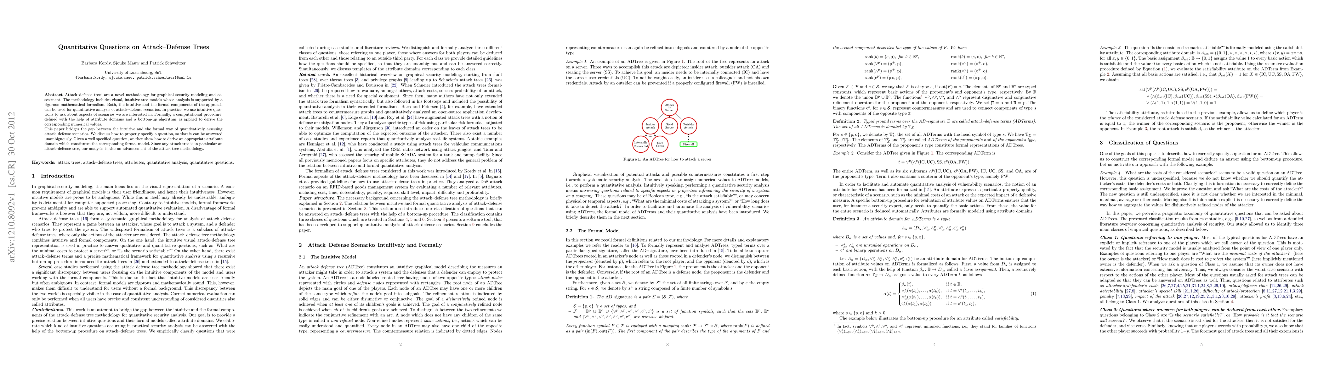 This paper introduces attack-defense trees for graphical security modeling and bridges the gap between intuitive and formal quantitative analysis. It outlines a method to specify questions and derive corresponding numerical values through a computational procedure, advancing the attack tree methodology.