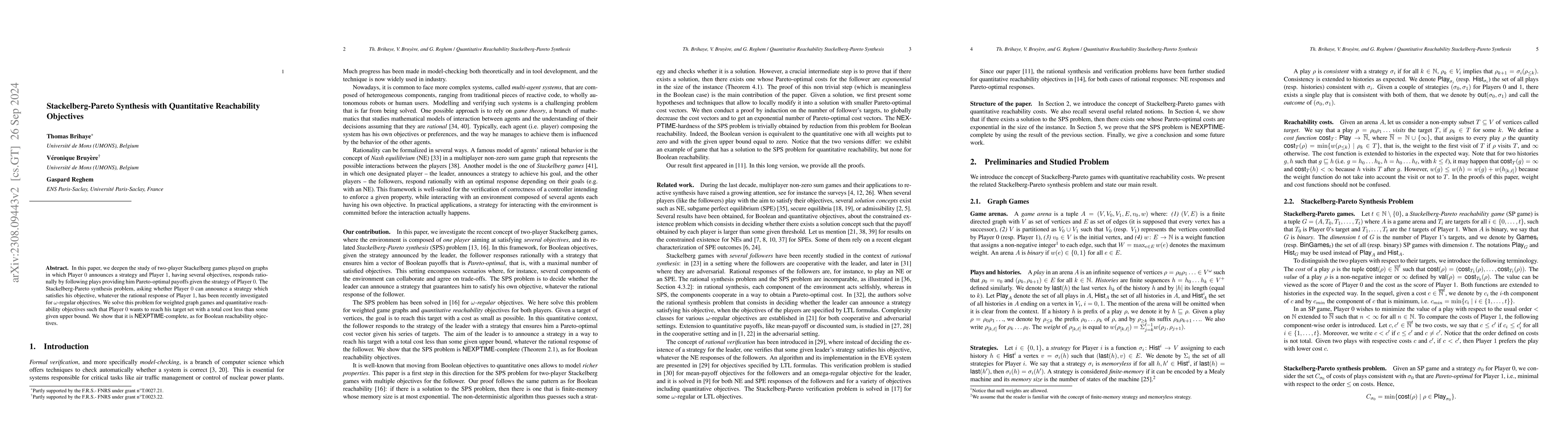 This paper investigates the complexity of Stackelberg-Pareto synthesis in two-player graph games with quantitative reachability objectives. It demonstrates that determining whether Player $0$ can achieve their target cost constraints, while Player $1$ responds rationally to maximize their objectives, is NEXPTIME-complete.