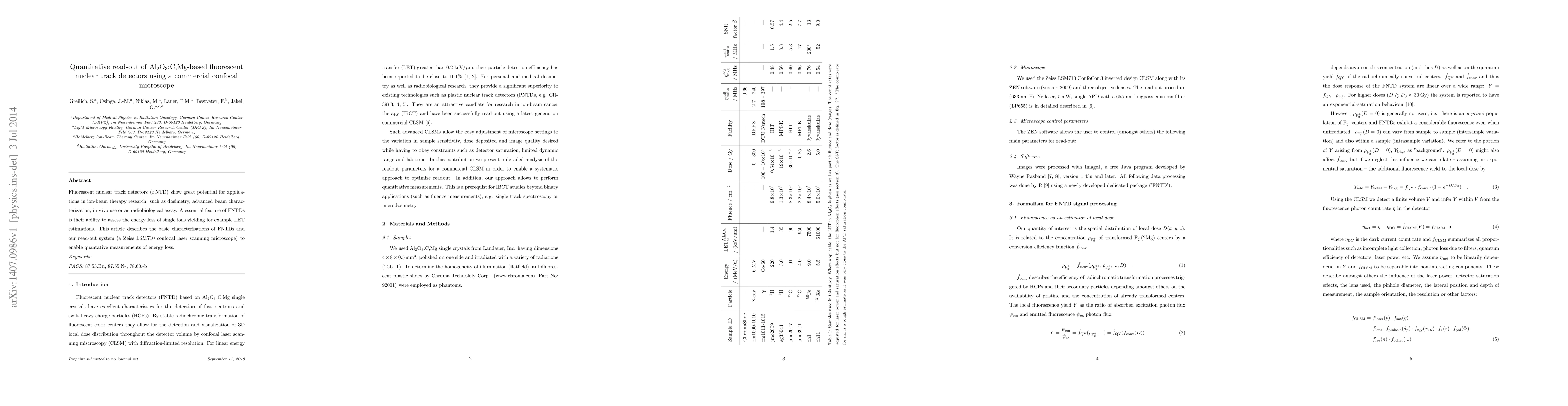 This paper investigates the use of Al2O3:C,Mg-based fluorescent nuclear track detectors (FNTDs) for ion-beam therapy research, employing a commercial confocal microscope for quantitative read-out. The study focuses on the potential of FNTDs for dosimetry and energy loss estimation, utilizing a Zeiss LSM710 confocal laser scanning microscope for precise measurements.