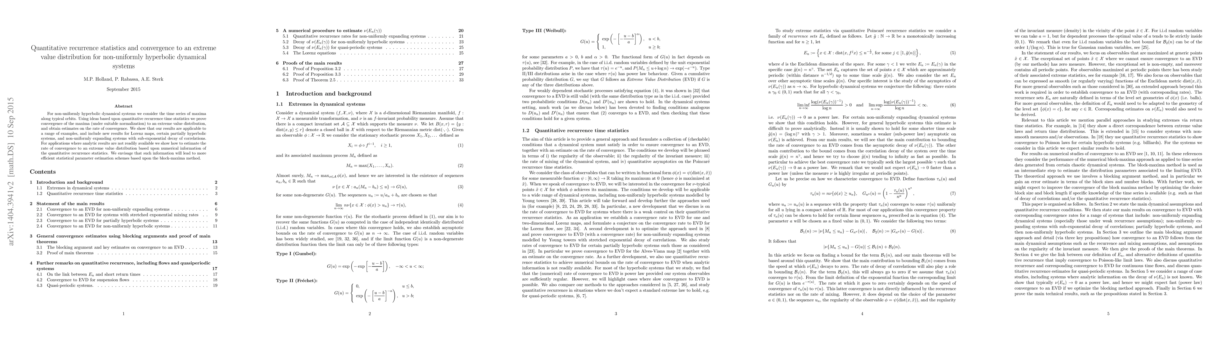 This paper proves the convergence of maxima along typical orbits in non-uniformly hyperbolic dynamical systems to an extreme value distribution, providing estimates on the rate of convergence. It applies these results to Lorenz maps, partially hyperbolic systems, and non-uniformly expanding systems, and suggests methods for estimating convergence rates based on numerical recurrence statistics.