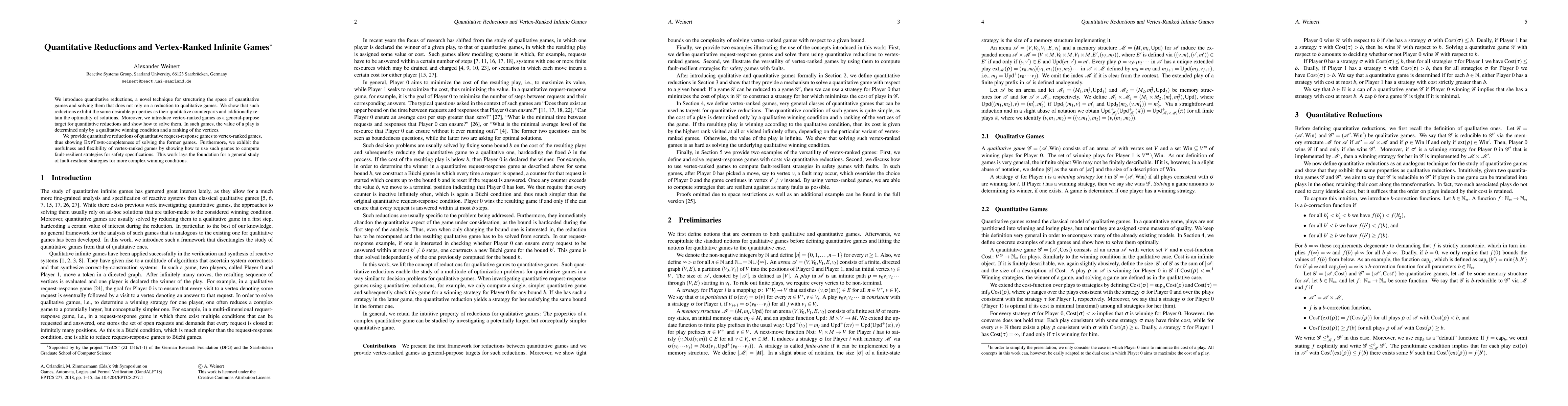 This paper introduces quantitative reductions, a new method for solving quantitative games without relying on qualitative reductions, preserving solution optimality. It also presents vertex-ranked games as a versatile target for these reductions, demonstrating their ExpTime-completeness and utility in computing fault-resilient strategies for safety specifications.