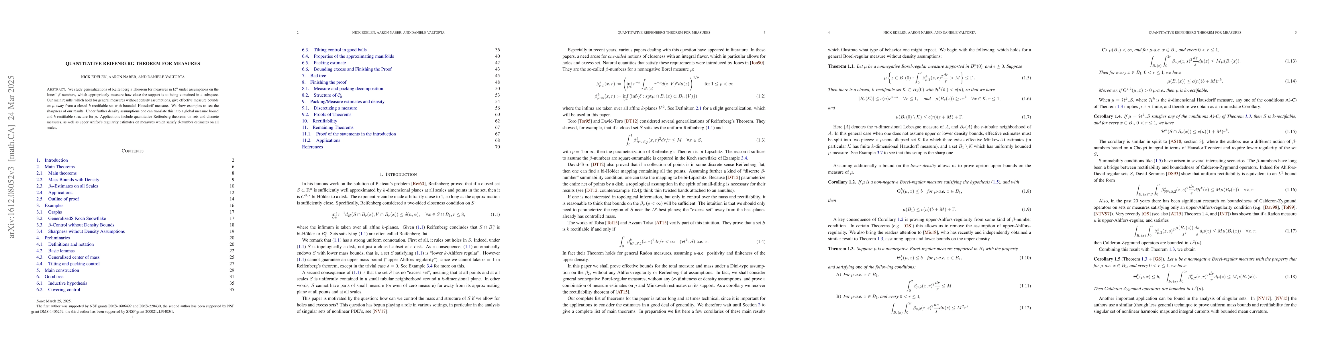 We study generalizations of Reifenberg's Theorem for measures in $\mathbb R^n$ under assumptions on the Jones' $\beta$-numbers, which appropriately measure how close the support is to being contained in a subspace. Our main results, which holds for general measures without density assumptions, give effective measure bounds on $\mu$ away from a closed $k$-rectifiable set with bounded Hausdorff measure. We show examples to see the sharpness of our results. Under further density assumptions one can translate this into a global measure bound and $k$-rectifiable structure for $\mu$. Applications include quantitative Reifenberg theorems on sets and discrete measures, as well as upper Ahlfor's regularity estimates on measures which satisfy $\beta$-number estimates on all scales.