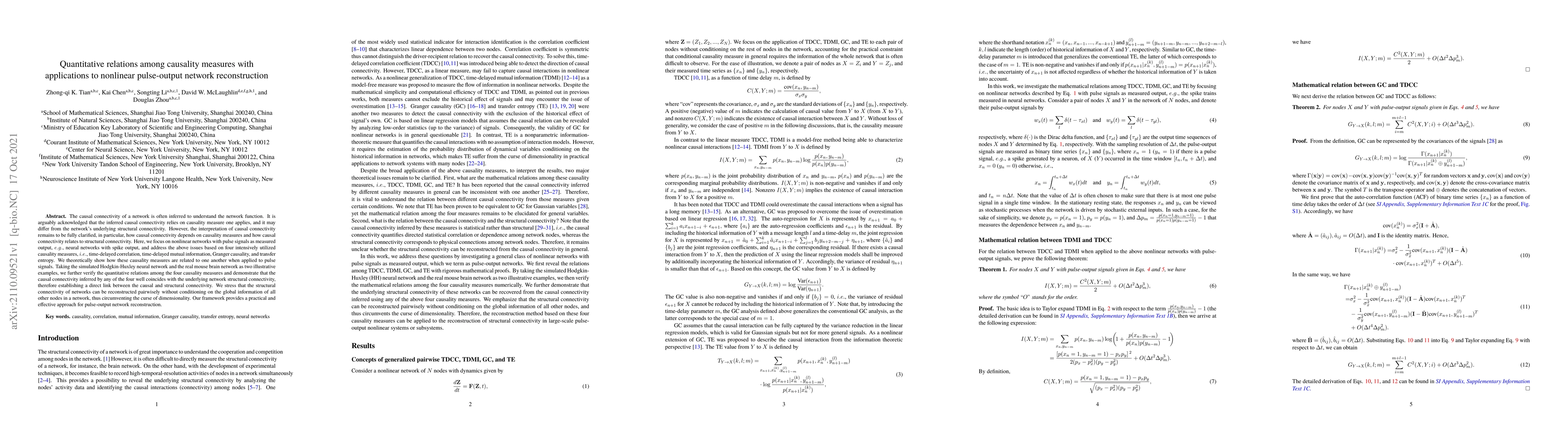This paper investigates the quantitative relationships among four commonly used causality measures—time-delayed correlation, time-delayed mutual information, Granger causality, and transfer entropy—in the context of nonlinear pulse-output networks, such as neural networks. It demonstrates that these measures are interrelated and can be used to reconstruct the underlying structural connectivity of networks, providing a practical method for network reconstruction without requiring global information.