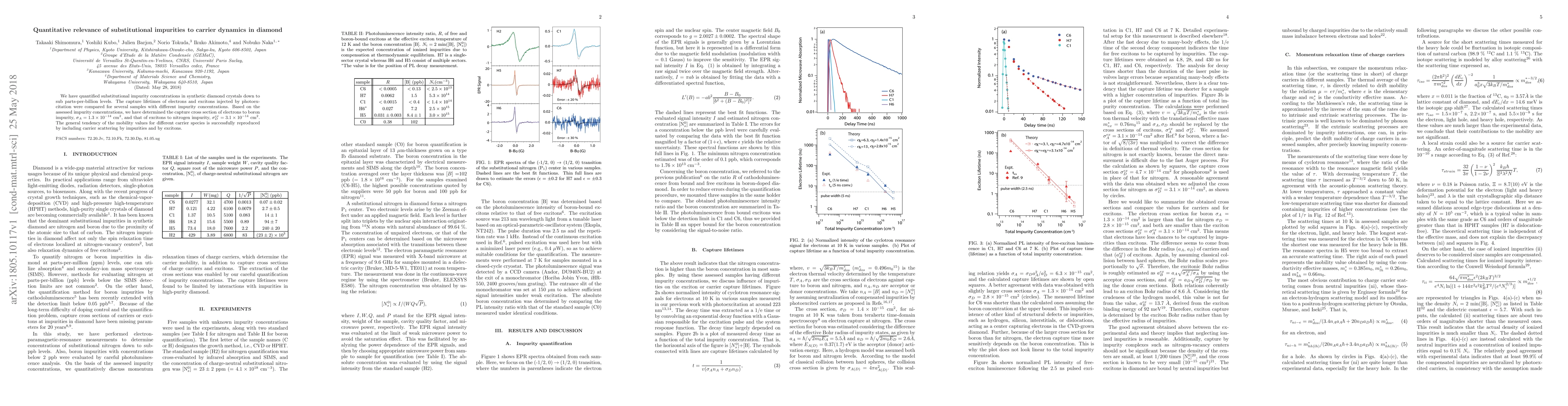 We have quantified substitutional impurity concentrations in synthetic diamond crystals down to sub parts-per-billion levels. The capture lifetimes of electrons and excitons injected by photoexcitation were compared for several samples with different impurity concentrations. Based on the assessed impurity concentrations, we have determined the capture cross section of electrons to boron impurity, sA=1.3x10^-14 cm2, and that of excitons to nitrogen impurity, sD^ex=3.1x10^-14 cm2. The general tendency of the mobility values for different carrier species is successfully reproduced by including carrier scattering by impurities and by excitons.