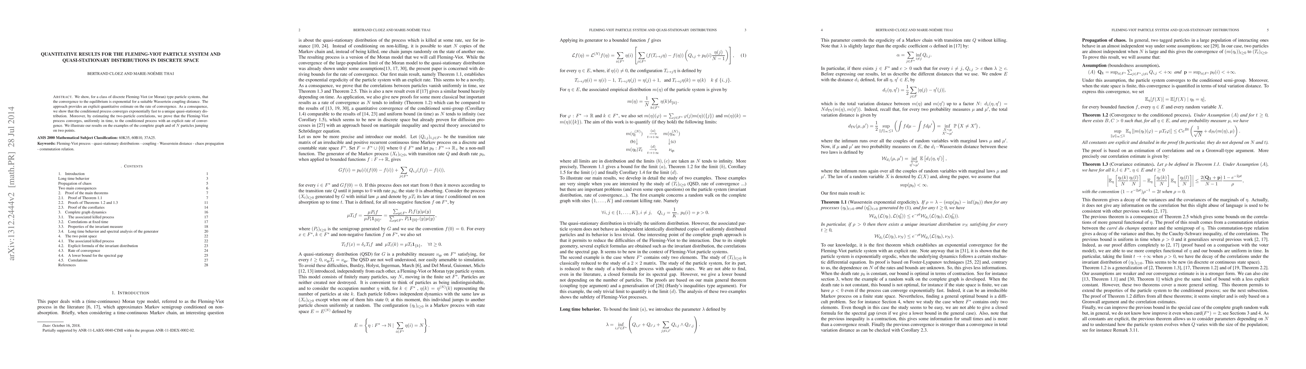 This paper demonstrates exponential convergence to equilibrium in discrete Fleming-Viot particle systems, providing explicit quantitative estimates on the rate of convergence. It also shows that conditioned processes converge exponentially to a unique quasi-stationary distribution, with uniform convergence to the conditioned process illustrated in examples of complete graphs and N particles on two points.