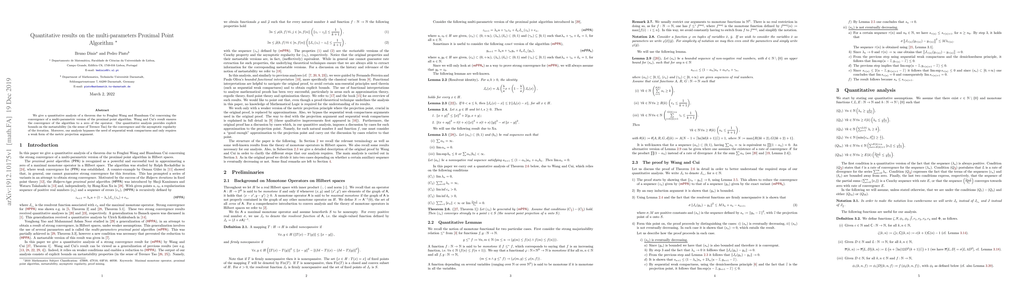 We give a quantitative analysis of a theorem due to Fenghui Wang and Huanhuan Cui concerning the convergence of a multi-parametric version of the proximal point algorithm. Wang and Cui's result ensures the convergence of the algorithm to a zero of the operator. Our quantitative analysis provides explicit bounds on the metastability (in the sense of Terence Tao) for the convergence and the asymptotic regularity of the iteration. Moreover, our analysis bypasses the need of sequential weak compactness and only requires a weak form of the metric projection argument.